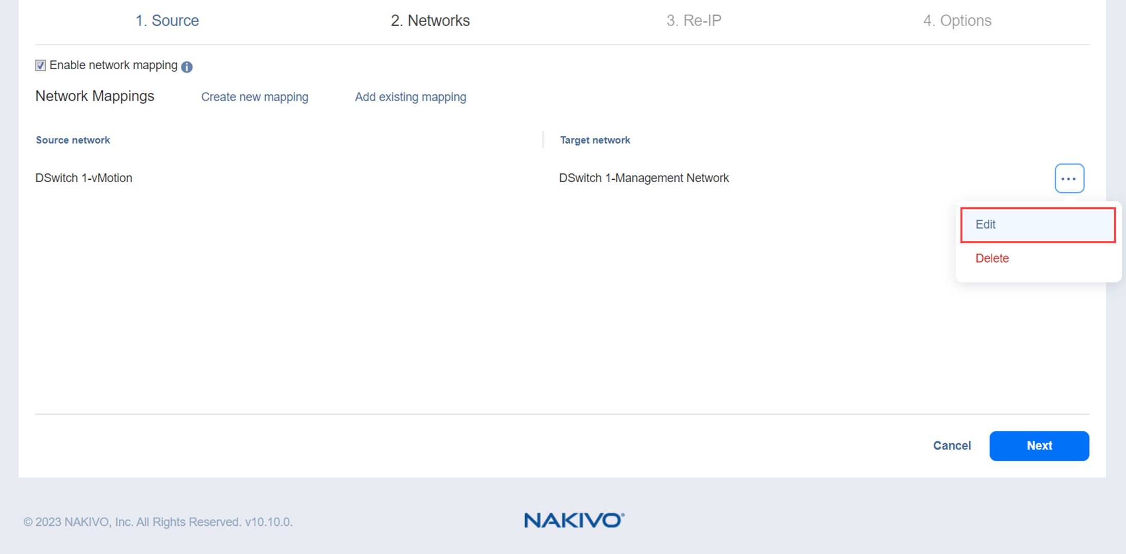 Delete an existing mapping: hover over the necessary item in the Network Mappings list and then click the ellipsis Manage button to the right of the item. Then, click Delete.