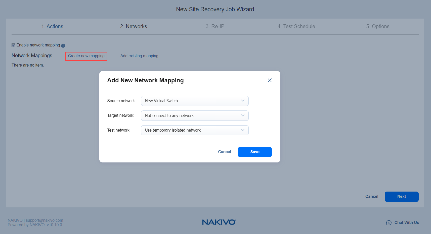 2. The Add New Network Mapping dialog opens. Choose a source network, a target network and a test network, and click Save.