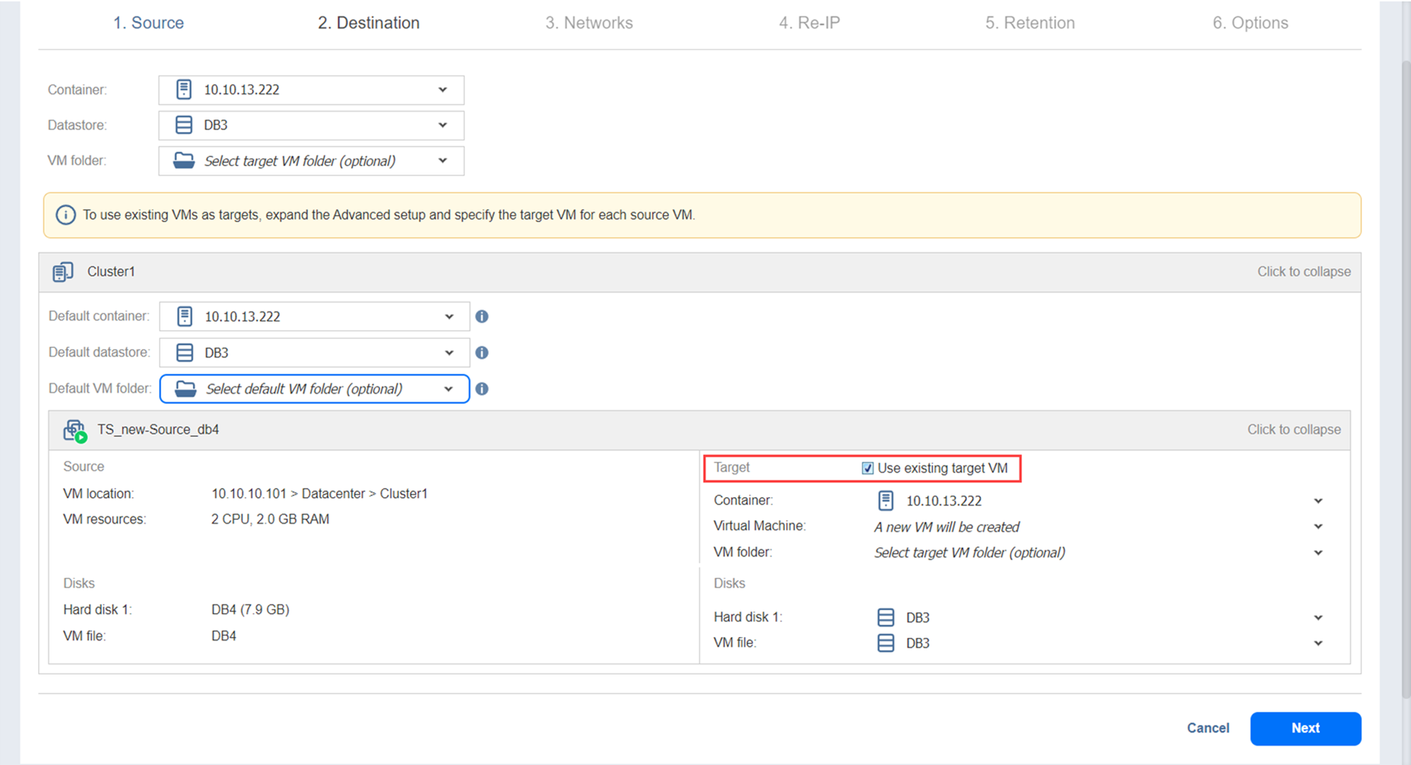 If you have chosen a host, cluster, folder, or a resource pool as a source for your replication job on the Source wizard page, you can set the default container, datastore, and VM folder for replicas. To do this, follow the steps below: