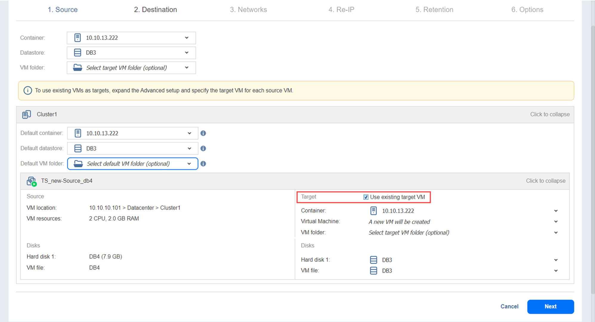If you want to perform staged replication or if you lose the replication job (due to accidental job deletion or because you need to recreate jobs in a new copy of the product), you can map source VMs to existing replicas to avoid running full VM replication again.