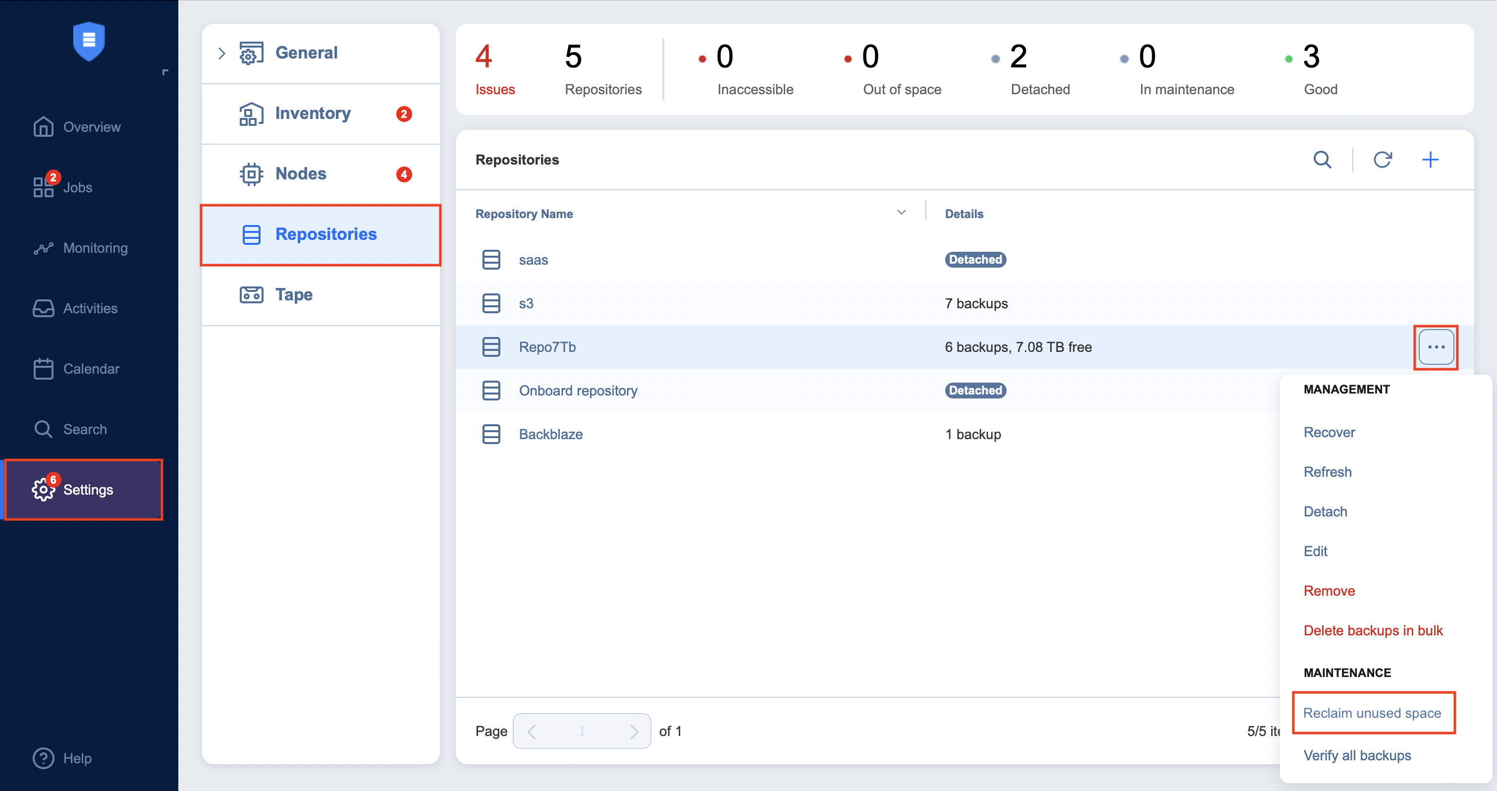 In the title of the Backup Repository, click ••• and then click Reclaim unused space.