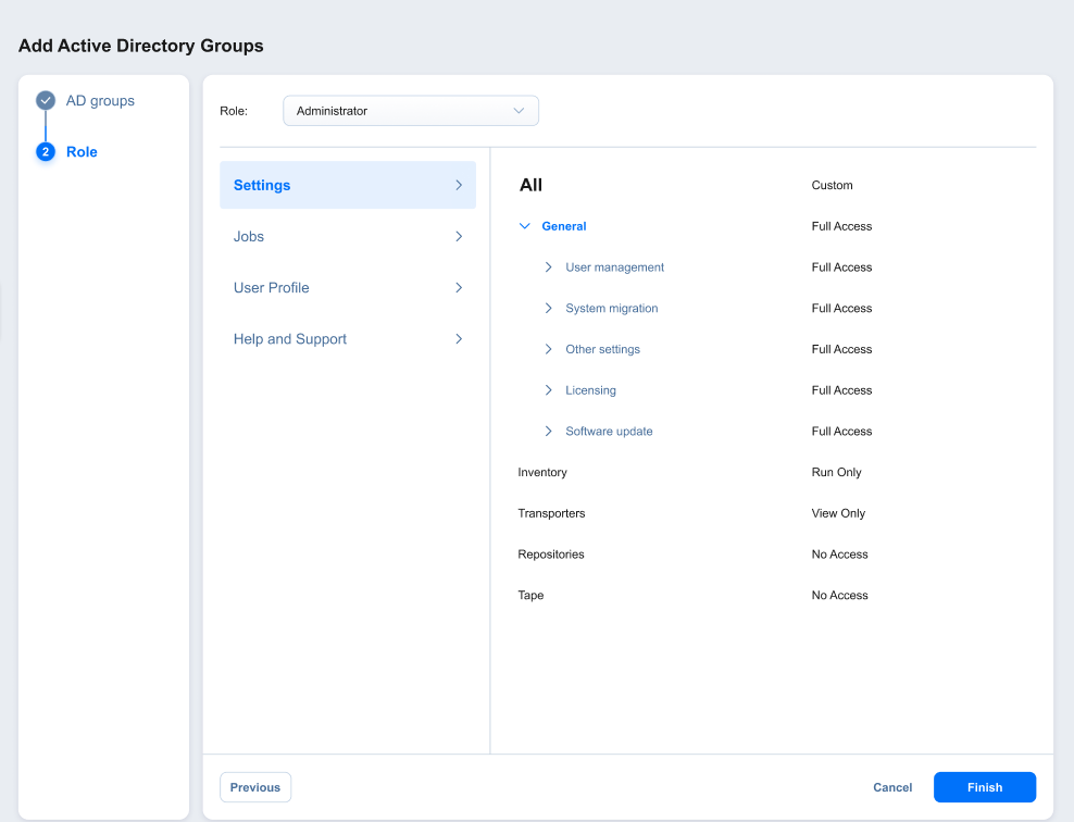 In the lower right corner of the page, click Finish. The selected AD groups with selected access level and role appear in the AD Groups tab.