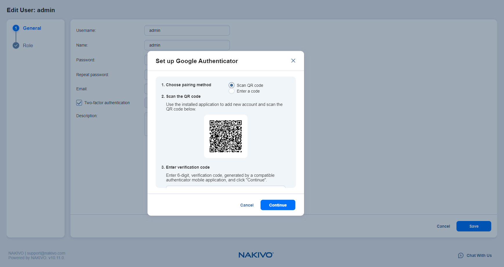 Add your NAKIVO Backup & Replication user account to Google Authenticator. Use one of the following methods: