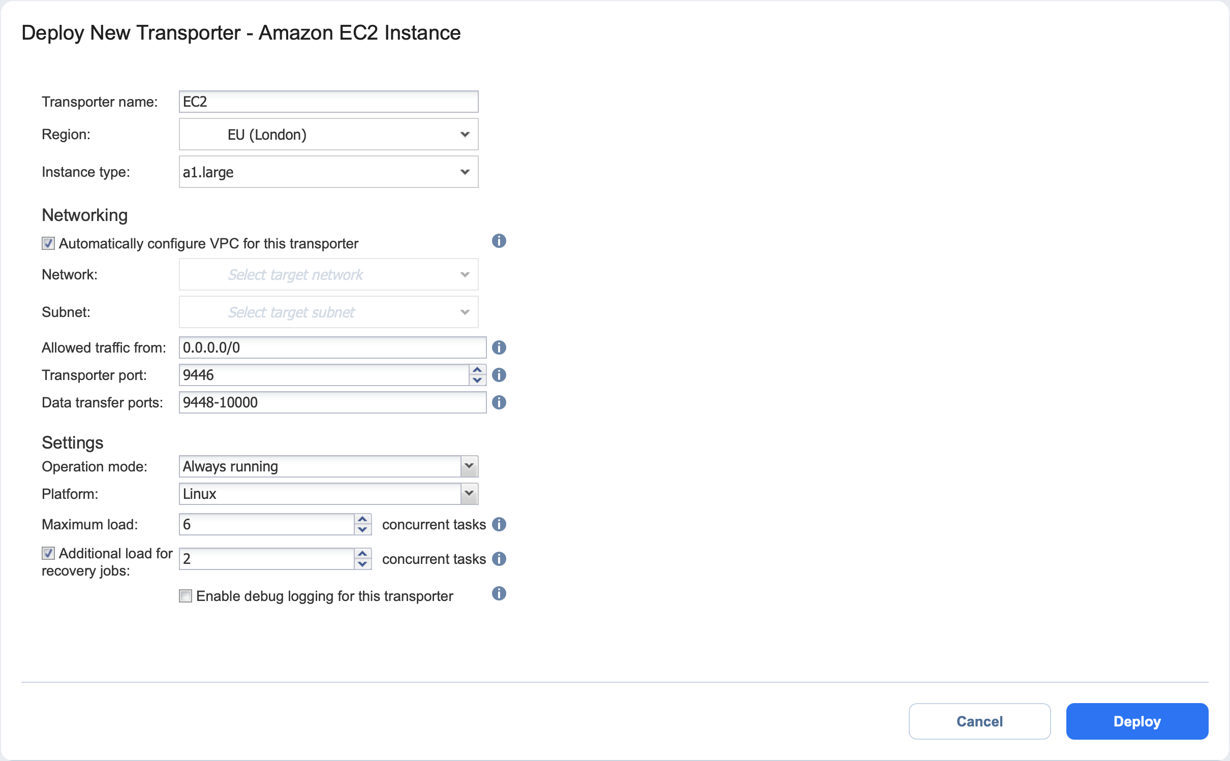 The Deploy New Transporter - Amazon EC2 Instance dialog opens. Fill out the fields as described below: