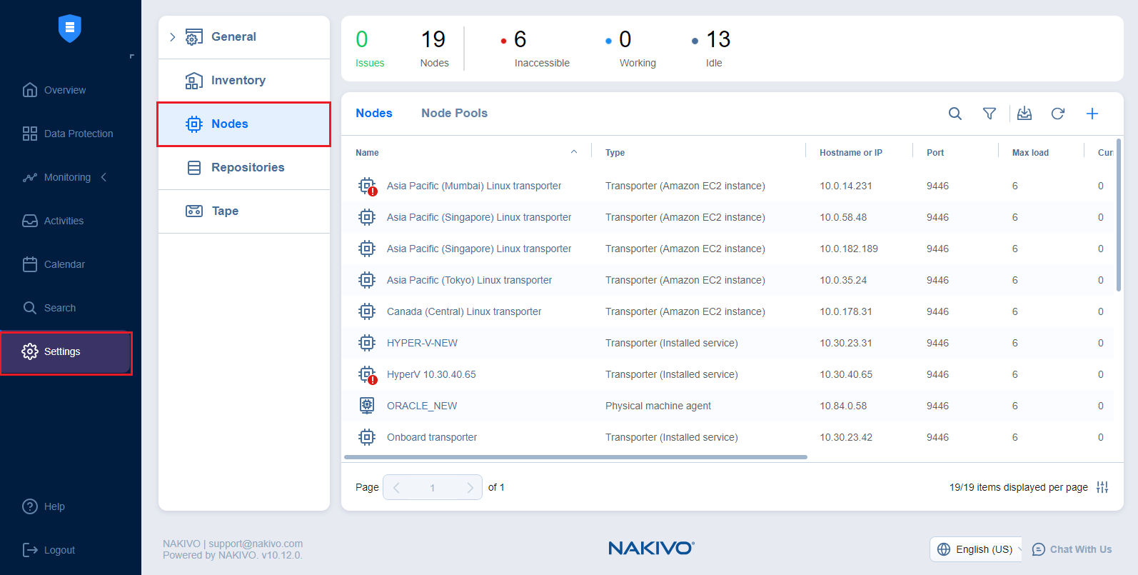 Nodes are an essential component of NAKIVO Backup & Replication. They include Transporters, VM Agents, and Physical Machine Agents. The Transporter, for example, performs backup, replication, and recovery, as well as data compression, deduplication, and encryption. The Nodes tab contains a Summary bar, which offers an overview of all nodes. The data displayed is as follows: