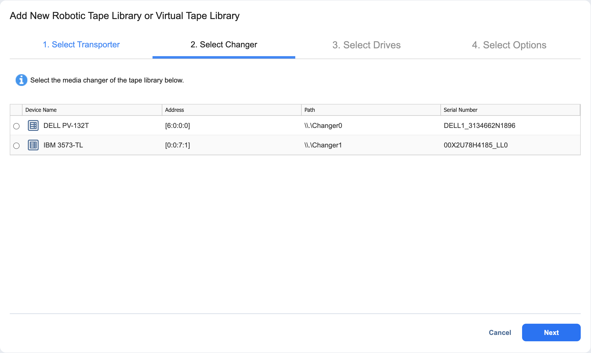 Select one media charger from the list. Media changers already being used in another discovered tape library are disabled.