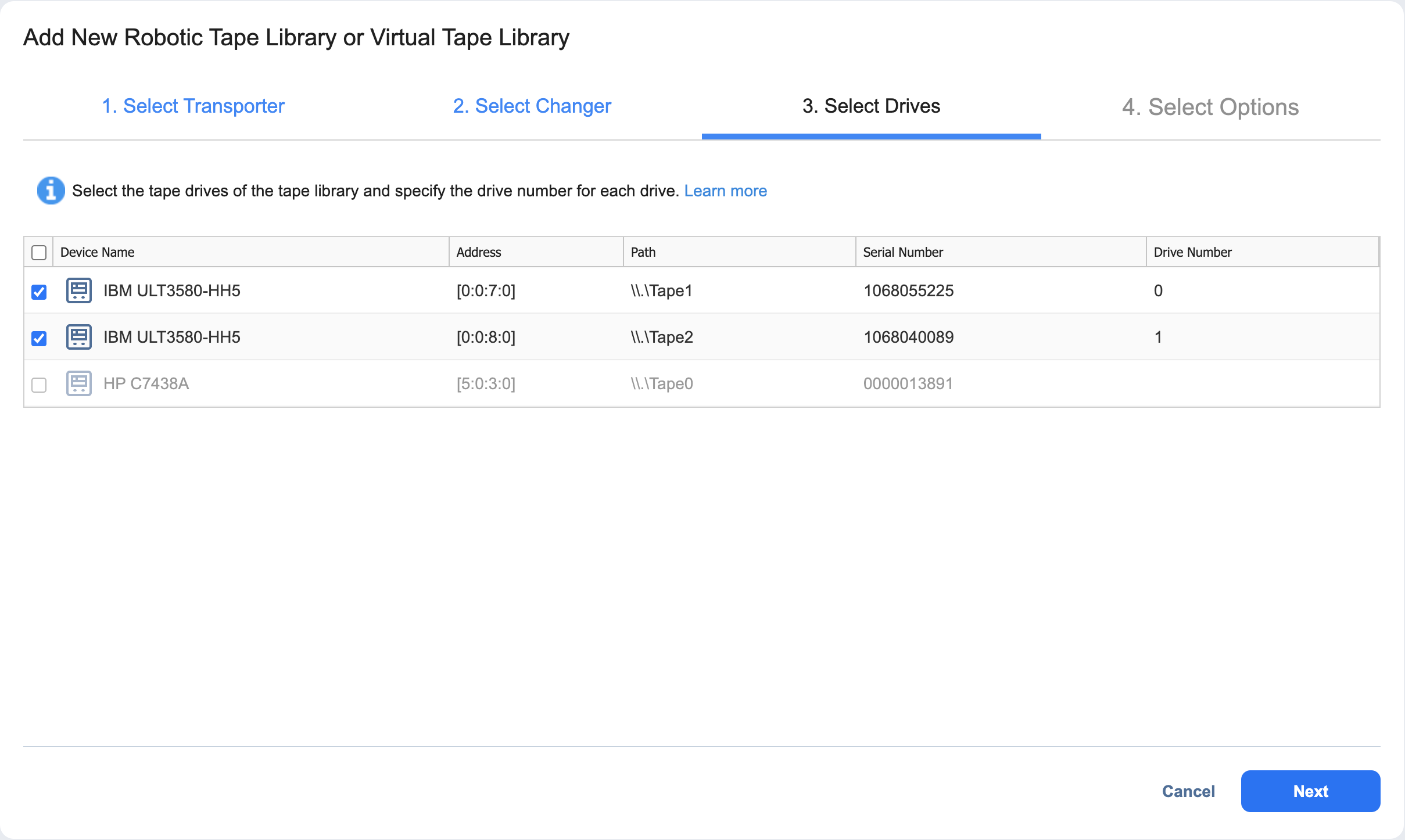 On the Select Drives page, you can select tape drives from the tape library and specify the actual drive number for each drive. Drives already used in another discovered tape device are disabled and cannot be selected. The table provides the following information:
