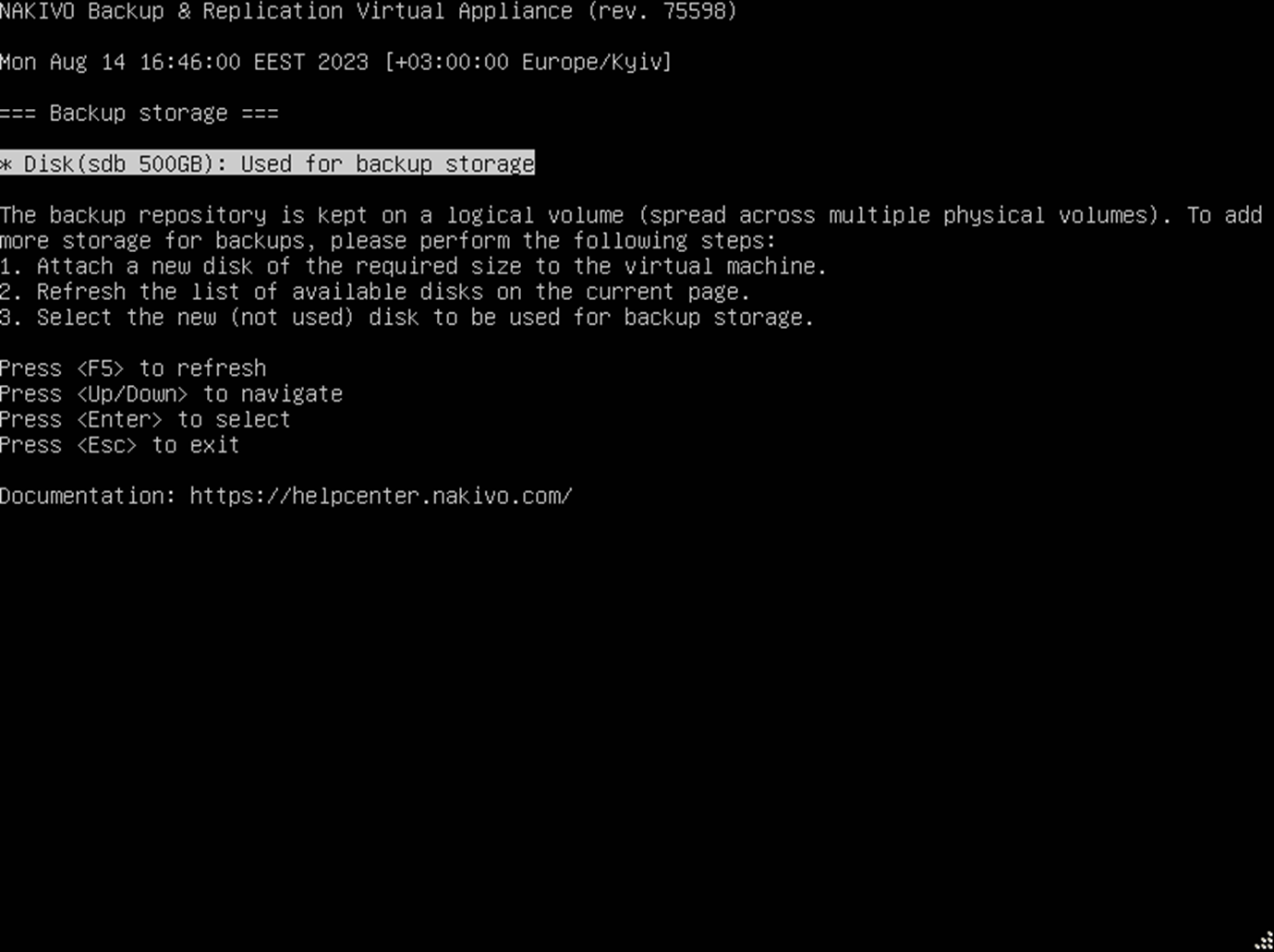 In this screen, you can also attach a new disk to your VA and then configure it for further use as backup storage by following the instructions on the screen.