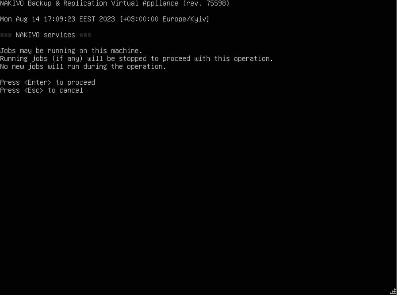 Select to manage the NAKIVO Backup & Replication Virtual Appliance services. The menu offers to select between three options: