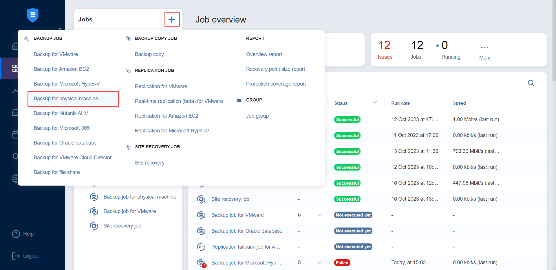 With NAKIVO Backup & Replication, you can back up both Windows and Linux physical machines. This can be done by creating a physical machine backup job that specifies which machines should be backed up, where the backups should be located, how often the backup should occur, and what backup options should be used. To create a physical machine backup job, click the plus Create button in the Data Protection menu and then click Backup for physical machine.