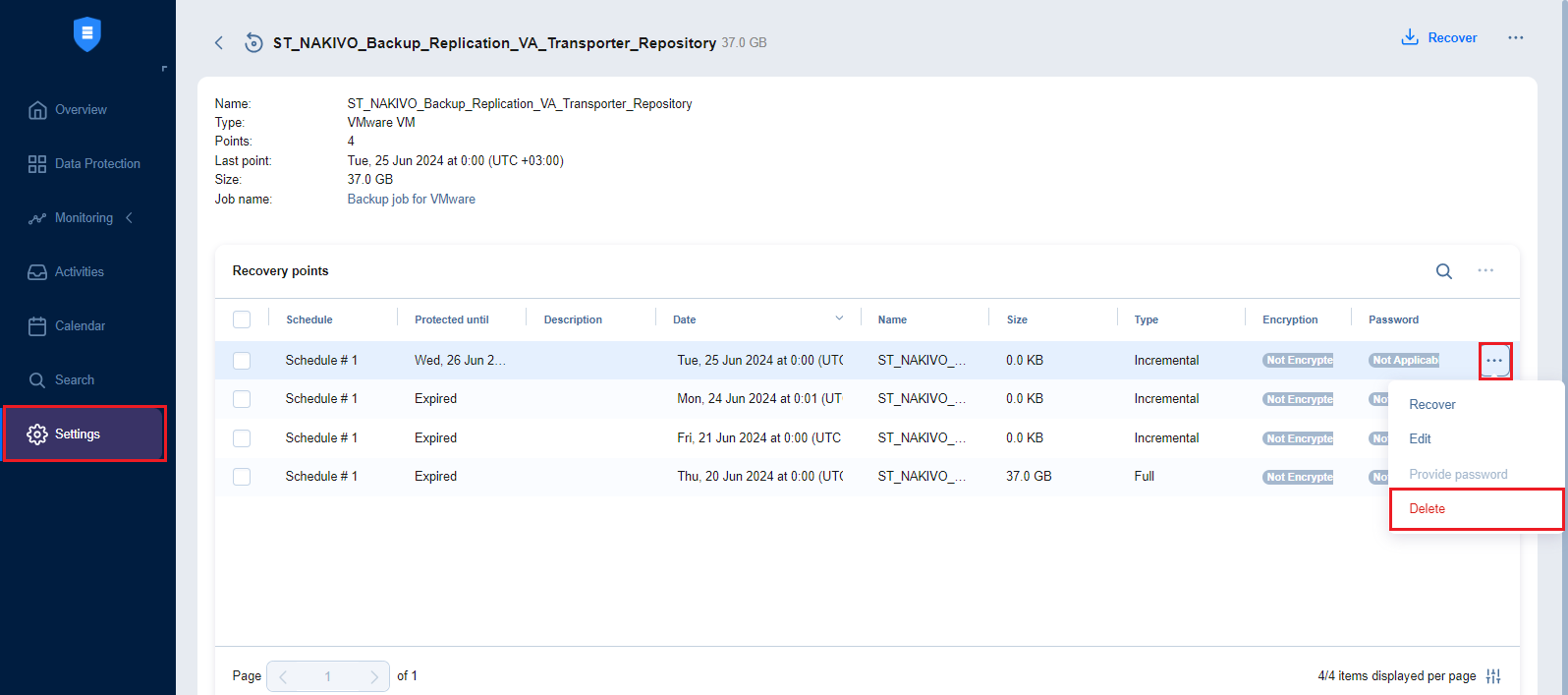 With NAKIVO Backup & Replication, you can permanently delete a backup with all of its recovery points if this backup is available in a Backup Repository. You can also delete specific recovery points in a backup without affecting any of the other recovery points. The option to delete a specific recovery point can be used if you get an alert about corrupted recovery points in a backup.