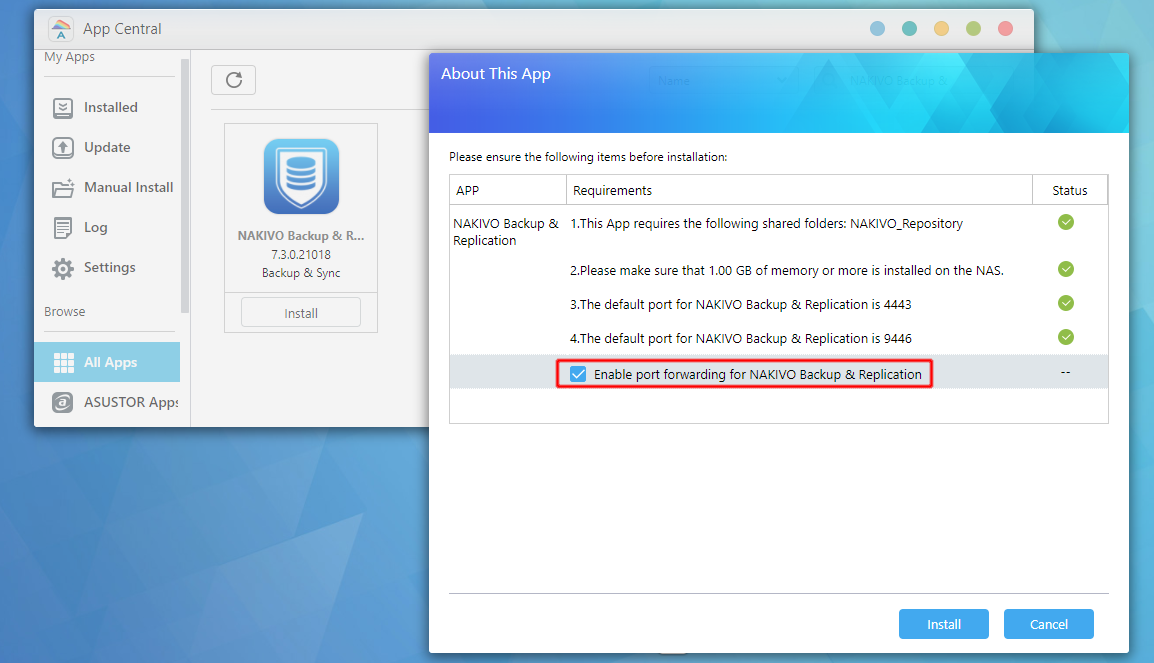 6. In the About This App dialog box that opens, select Enable port forwarding for NAKIVO Backup & Replication and then click Install.