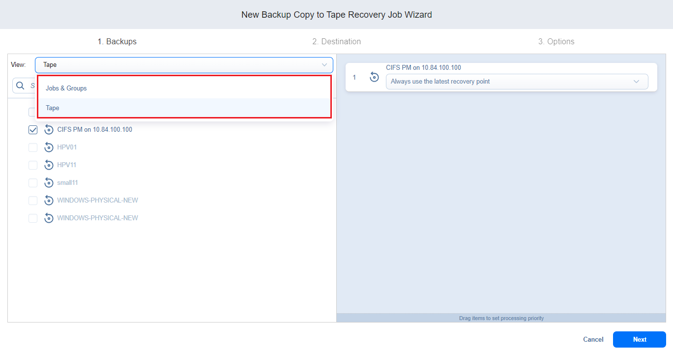 Backup Copy to Tape Recovery Job Wizard: Backups