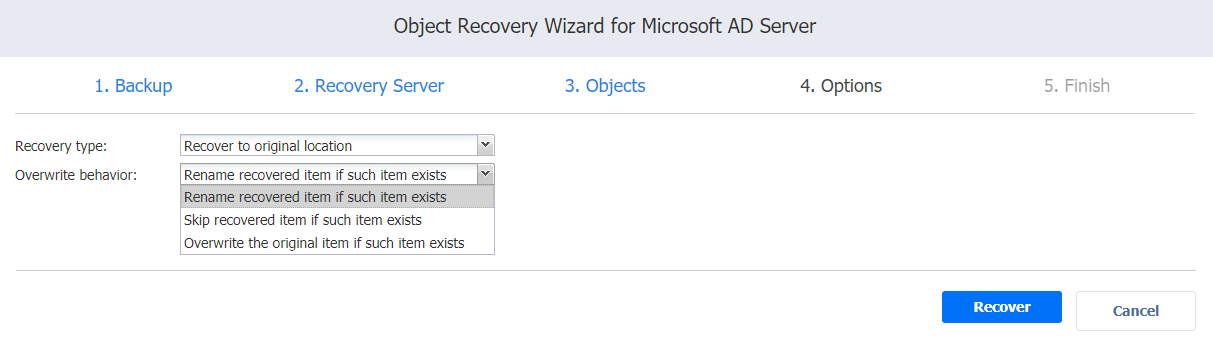 3. In the Overwrite behavior list, select what needs to be done if the recovered item conflicts with an existing item. Refer to the section above for an explanation.