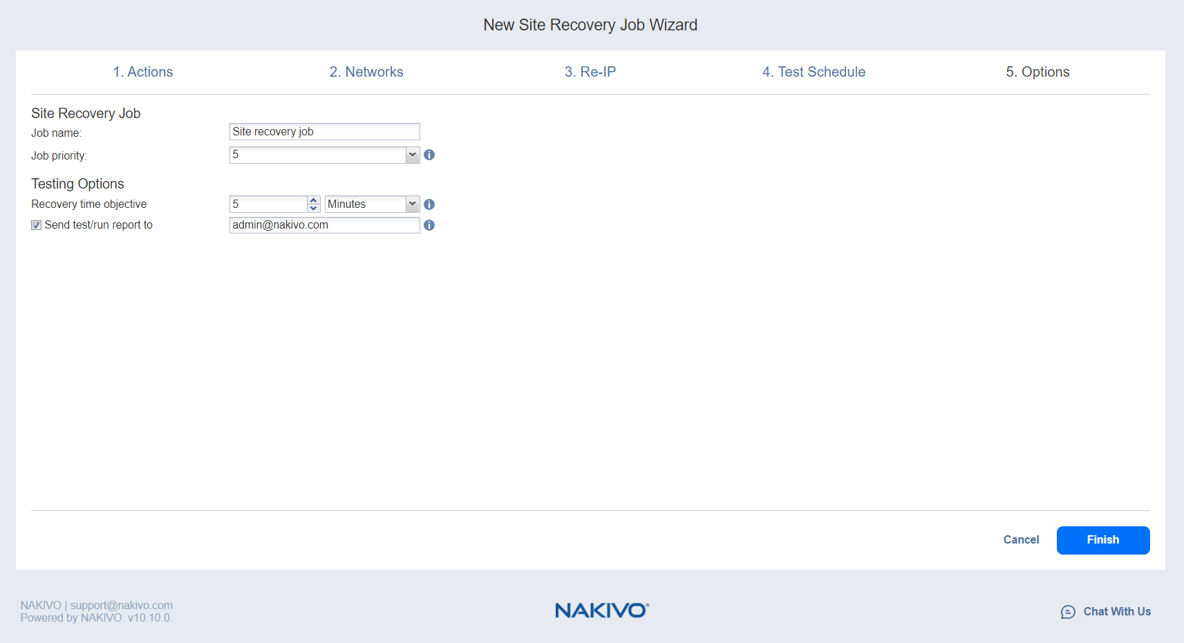 On the Options page of the Site Recovery Job Wizard you can specify the options of the site recovery job.