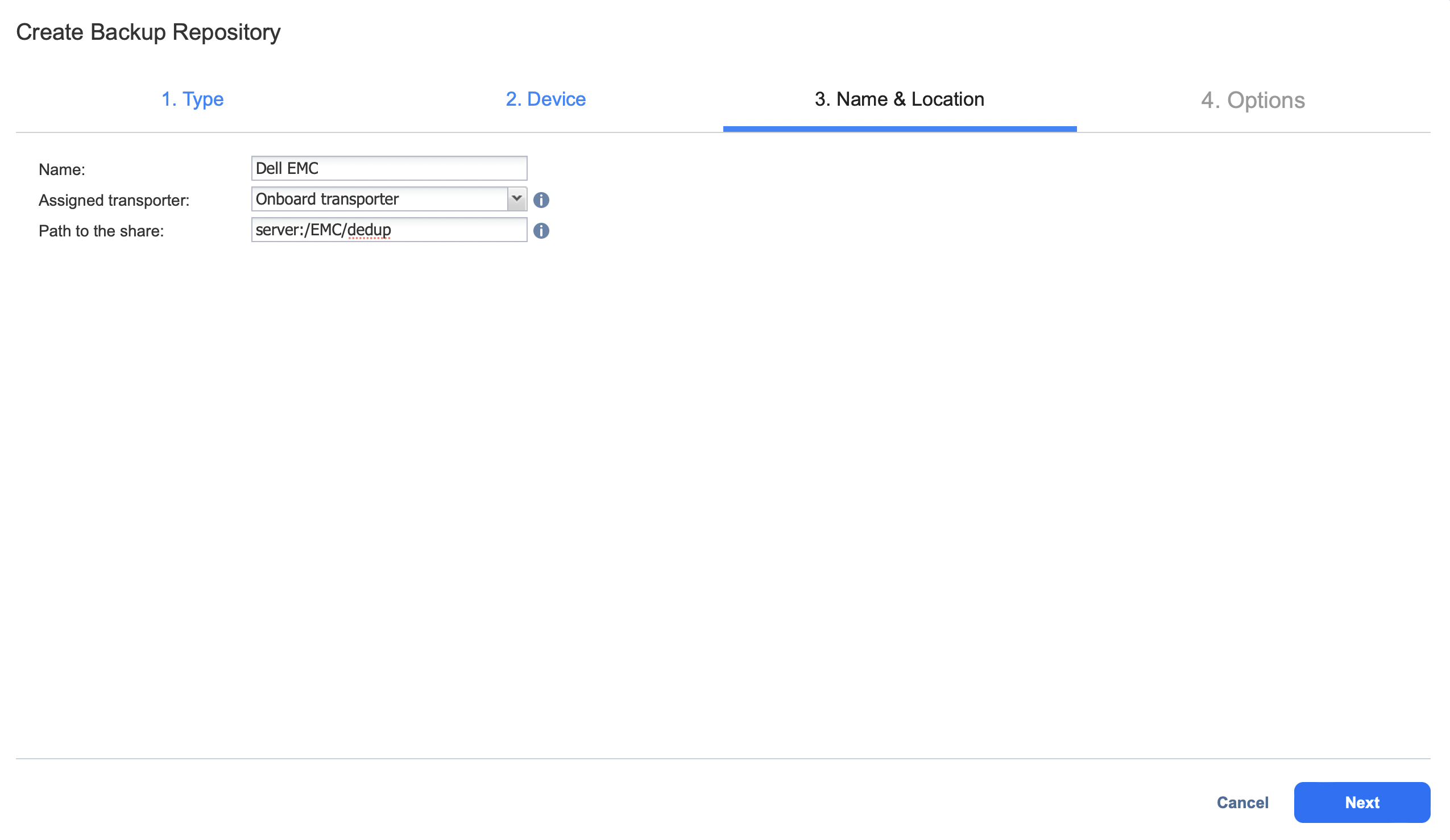 <backup_appliance>:/<storage_unit>. Refer to Creating a NAKIVO Backup & Replication Backup Repository on EMC Data Domain Backup Appliance for details.