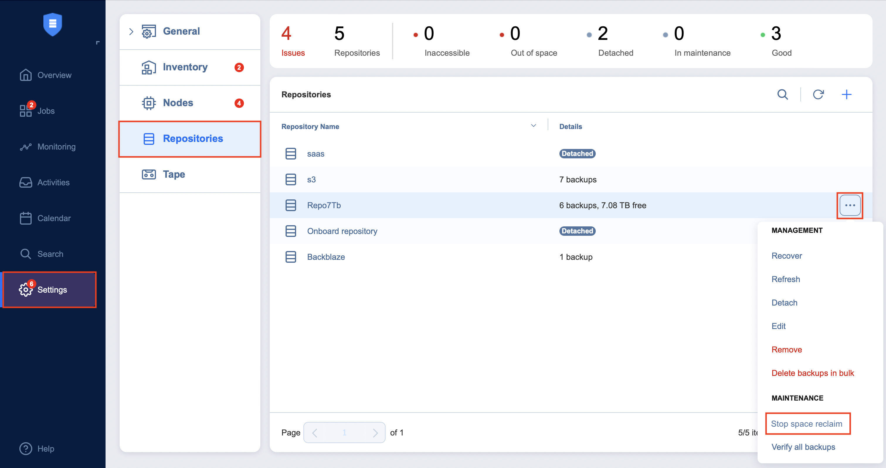 3. In the title of the Backup Repository, click ••• and then click Stop space reclaim.