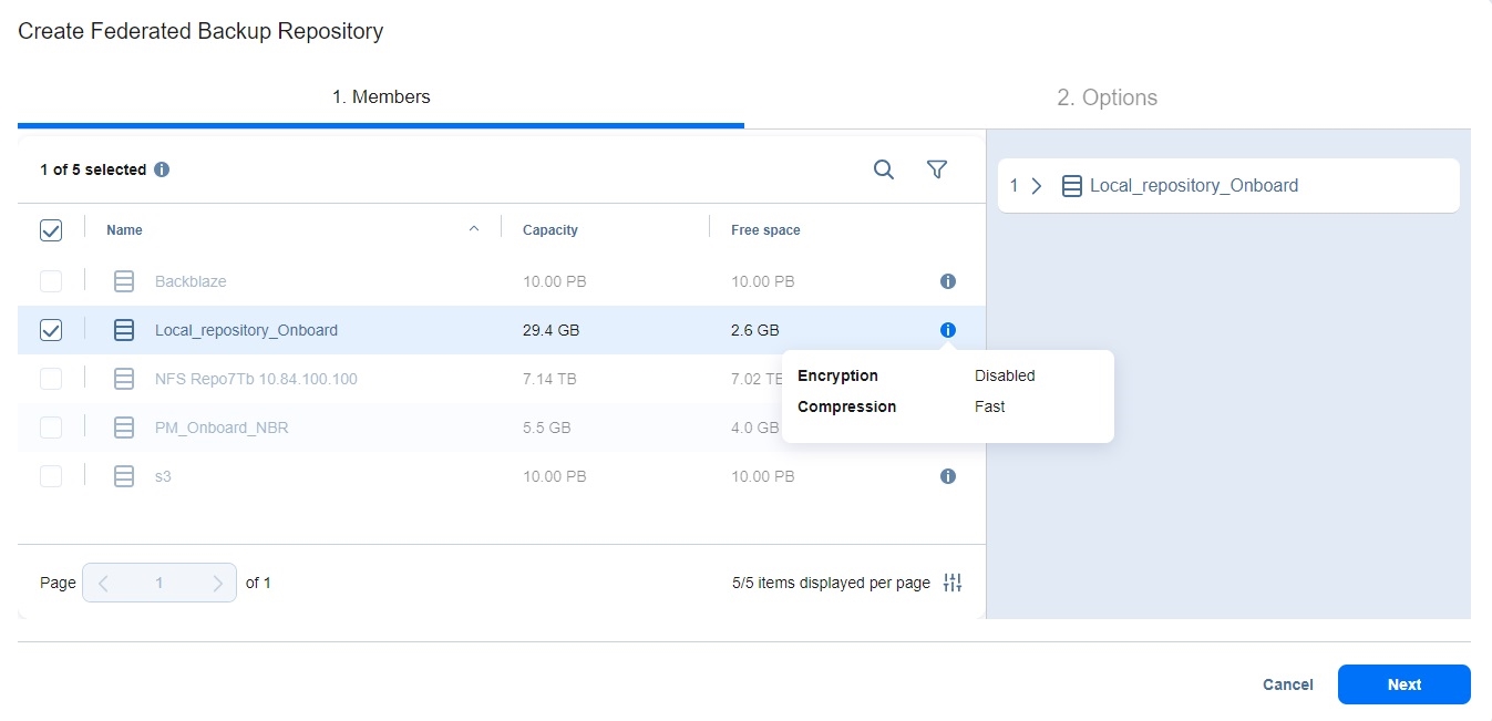 Repositories that are already used as members of other federated repository(ies), repositories (and their members) containing a self-backup or selected as a self-backup storage, and those assigned to tenants are disabled.