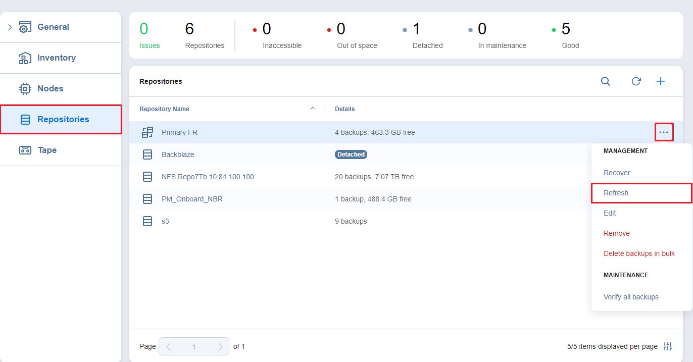 By default, NAKIVO Backup & Replication refreshes federated repository information hourly. During the refreshing process, the product collects all required information about federated repositories, such as the amount of available free space, number of backups, and number of recovery points.