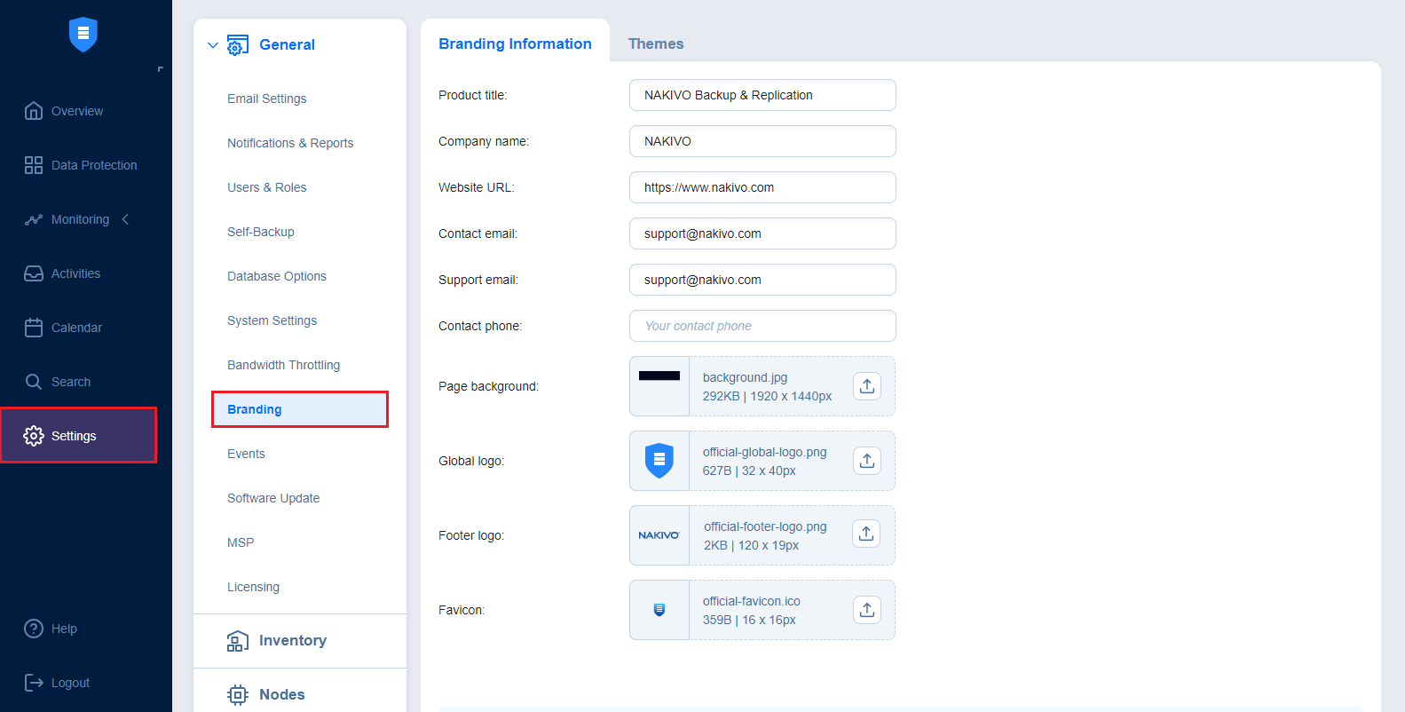 4. On the Themes tab, you can configure the colors of your NAKIVO Backup & Replication instance.
