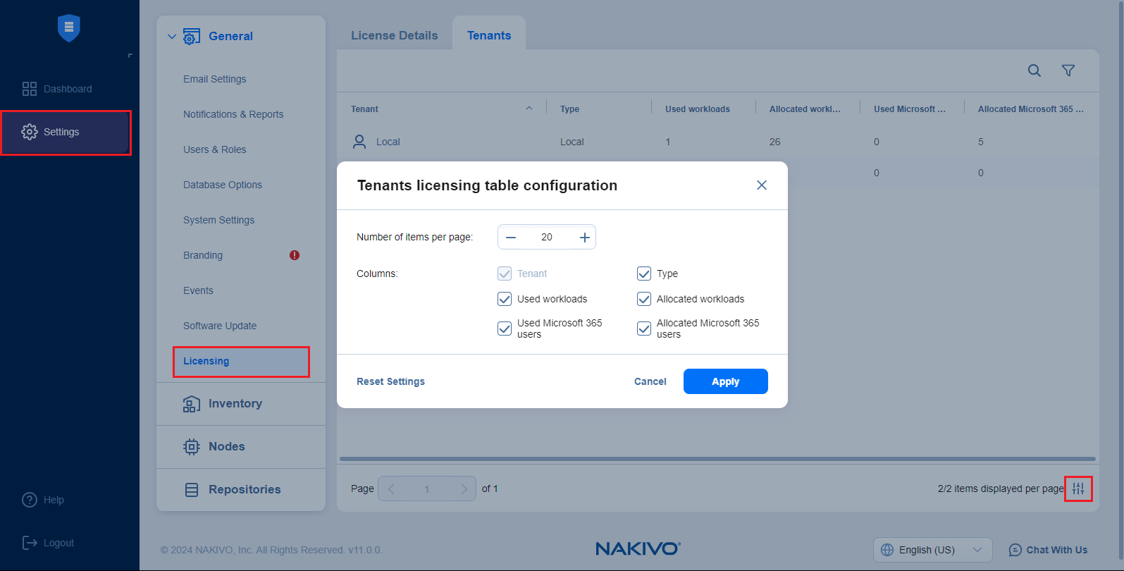 Optionally, you can show/hide columns or modify the number of items per page in the Tenants licensing table configuration table. In the lower right corner, click the controls icon. In the dialog window that opens, select/deselect checkboxes and click Apply.