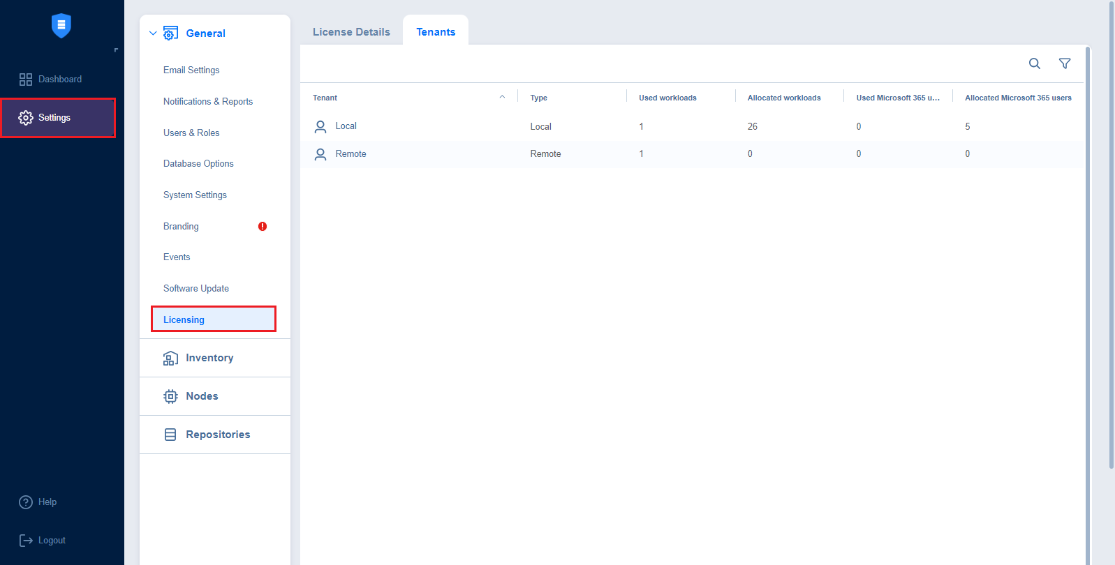 • Clicking the name opens the Licensing tab of the corresponding tenant.