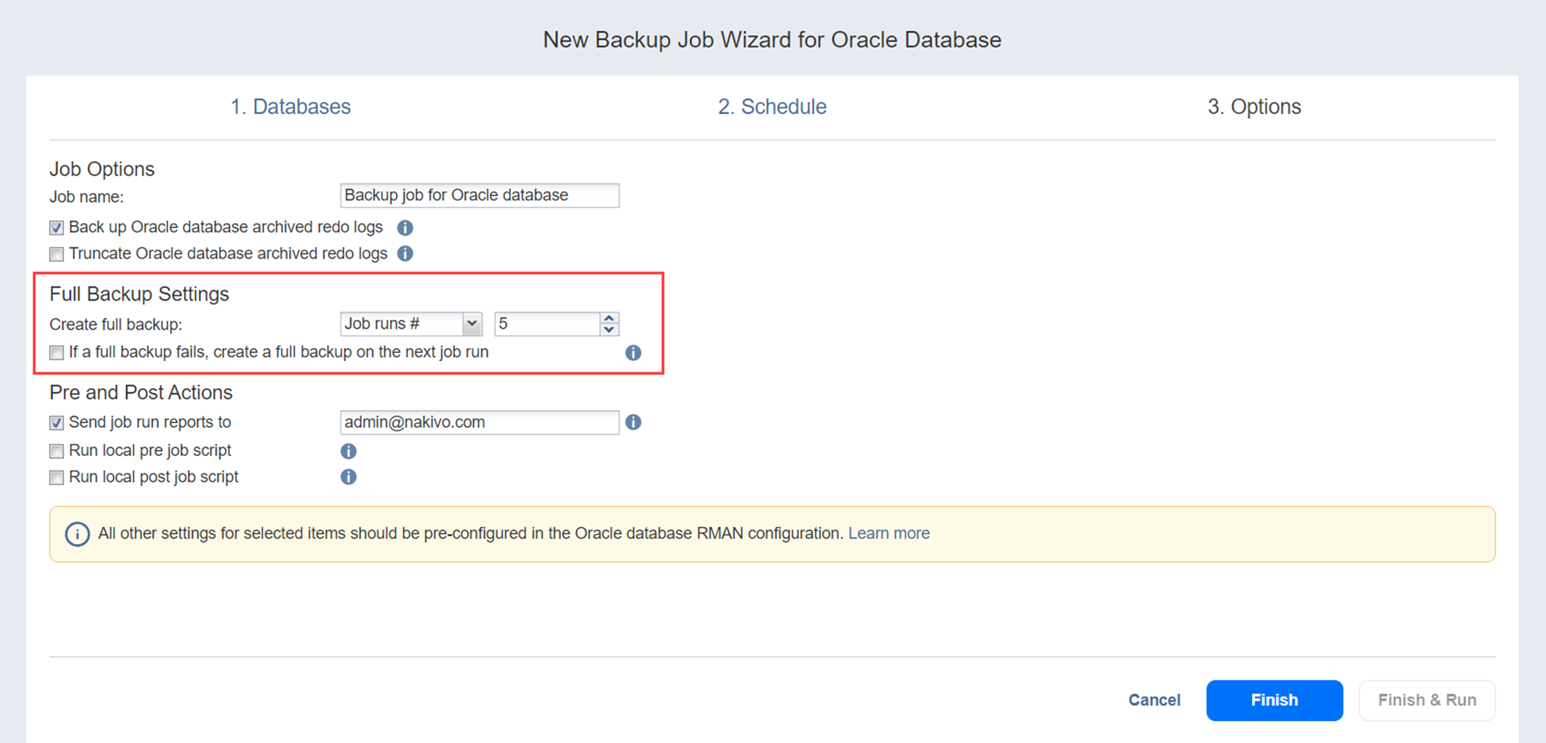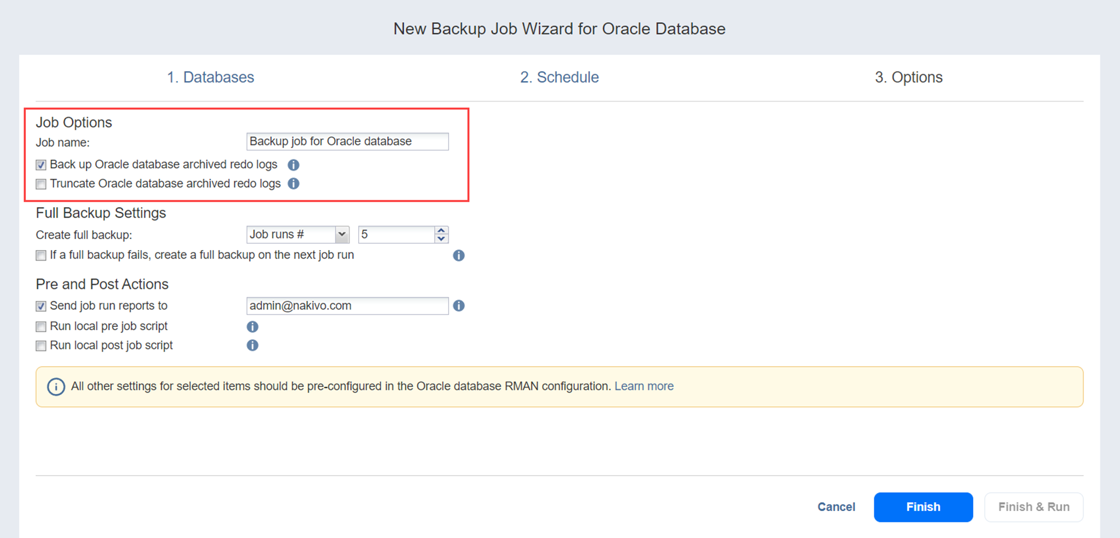 On the Options page of the wizard, you can name the job, choose to back up and truncate Oracle database archived redo logs, set full backups as well as pre and post job actions.