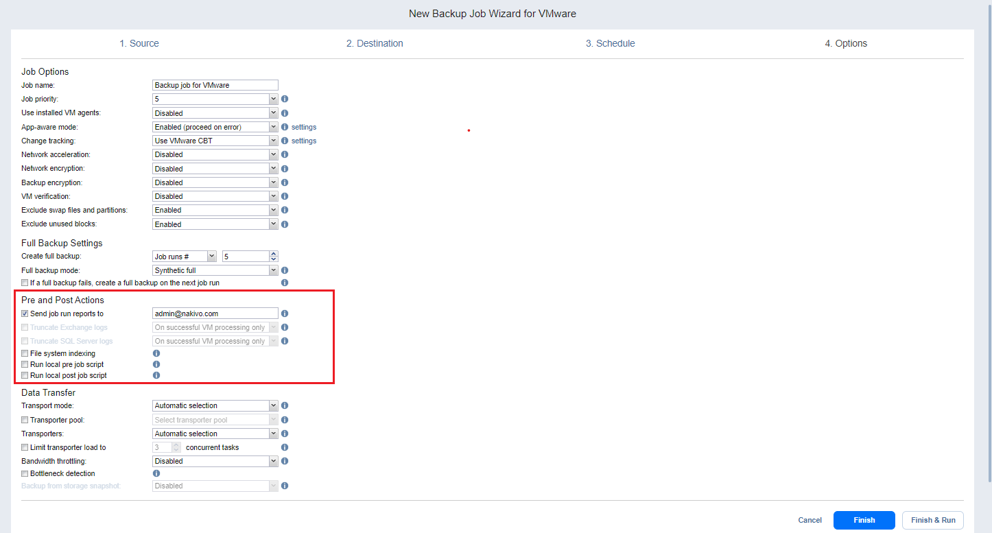 NAKIVO Backup & Replication allows you to enable certain actions before a backup job begins and after it has completed. You can choose to send job run reports, truncate Microsoft Exchange and Microsoft SQL Server logs on specified VMs, and run local pre- and post- job scripts.
