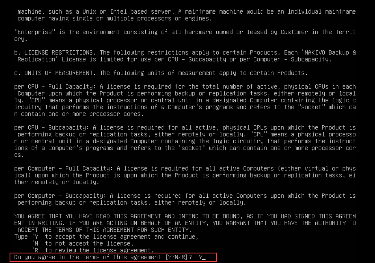 Review the End User License Agreement. Press Space to go to the bottom of it. If you agree to the terms of the agreement, type Y and then press Enter to begin the update process.