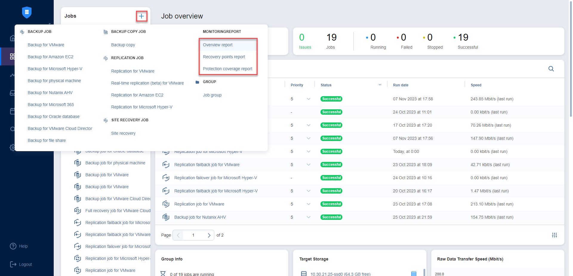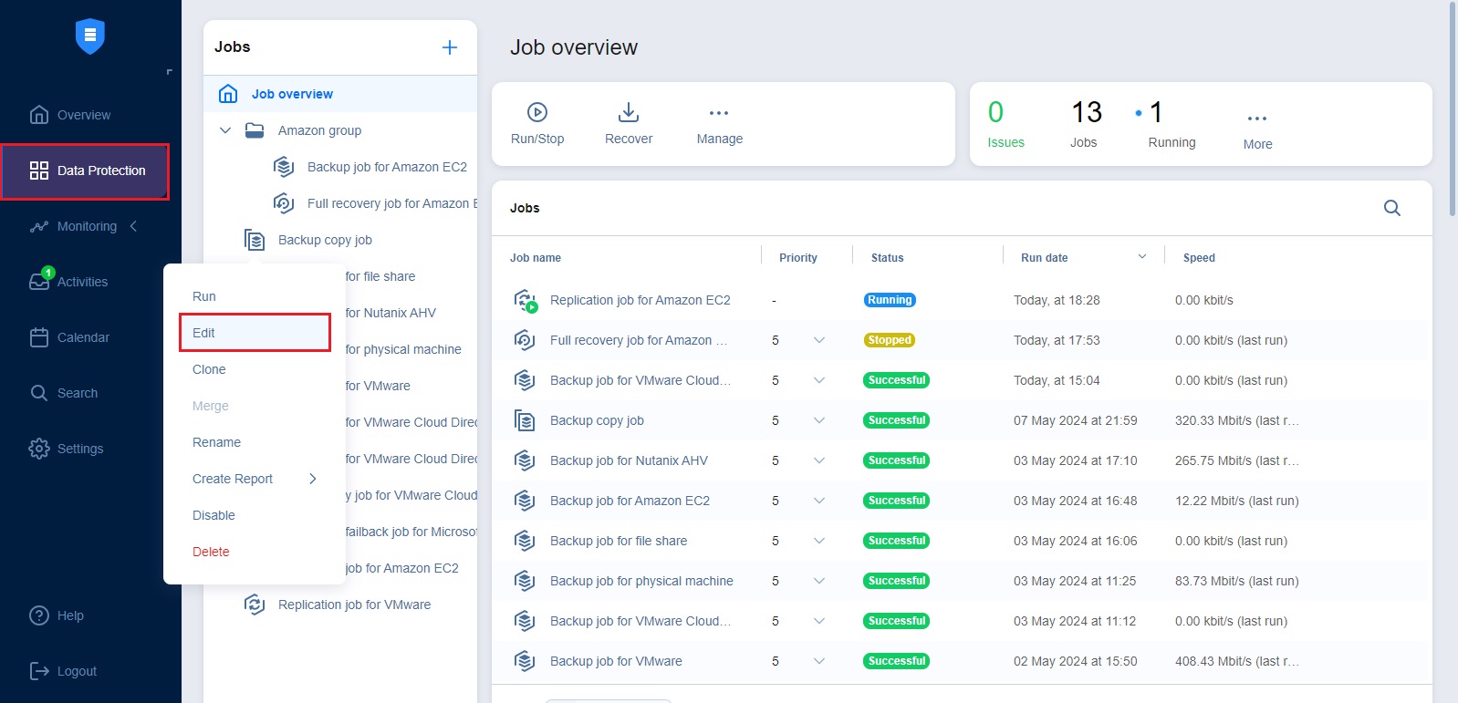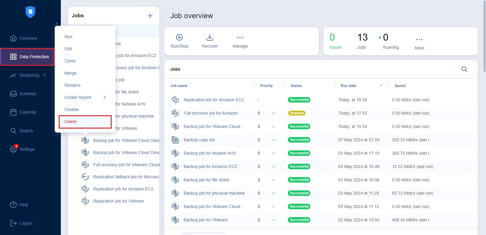 Using the Data Protection menu, you can easily manage jobs. Use the Manage menu to rename, edit, merge, delete, and enable/disable jobs.