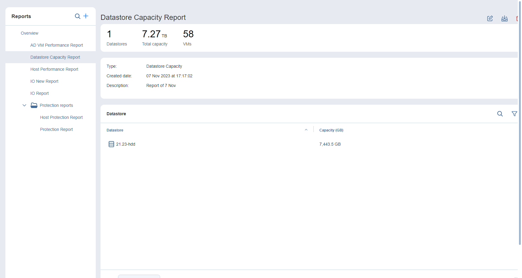 The Reports dashboard allows you to add and view different types of reports about the monitored items in your VMware vSphere infrastructure. You can group reports, export reports to PDF or CSV format, as well as edit and delete them.