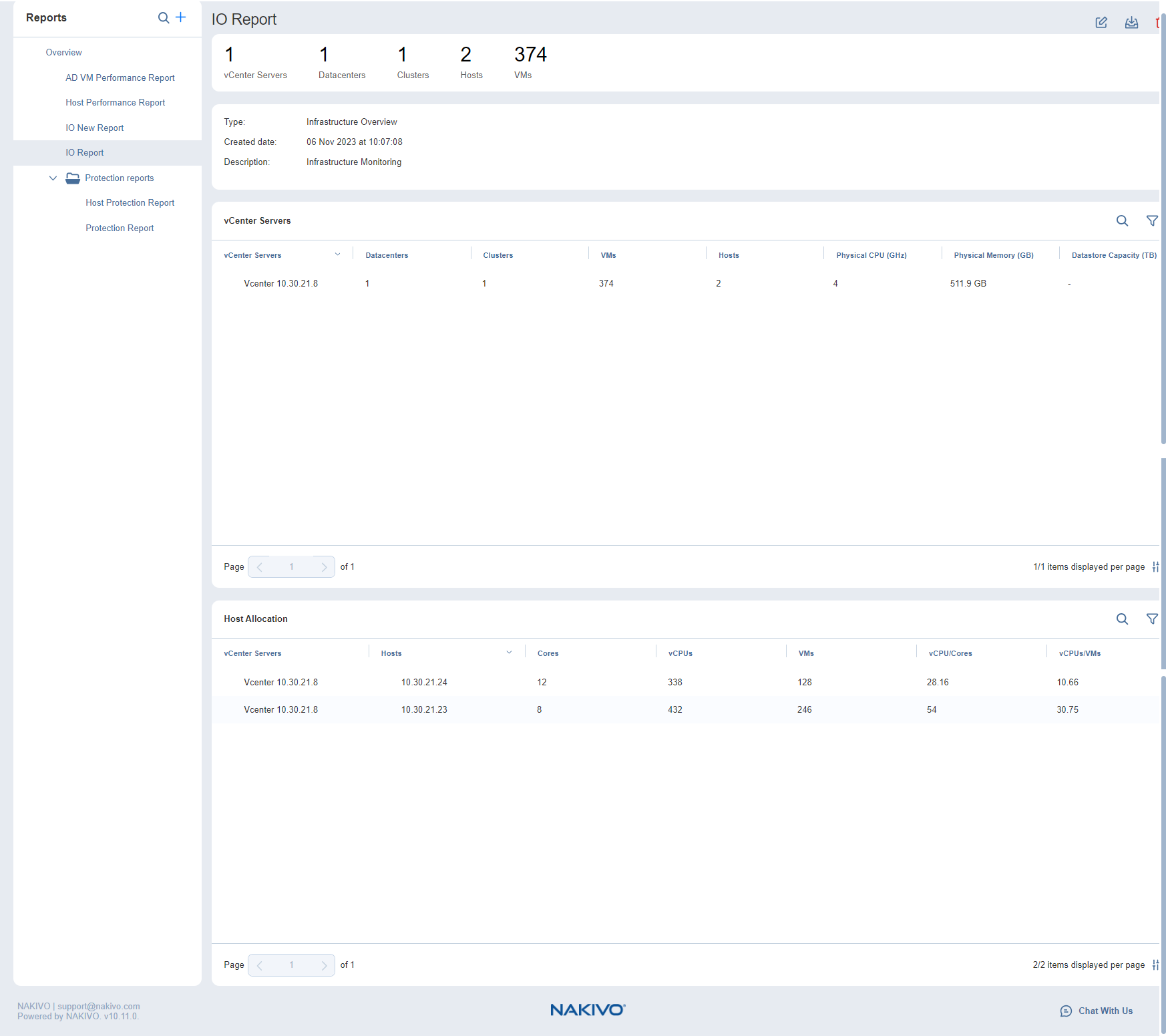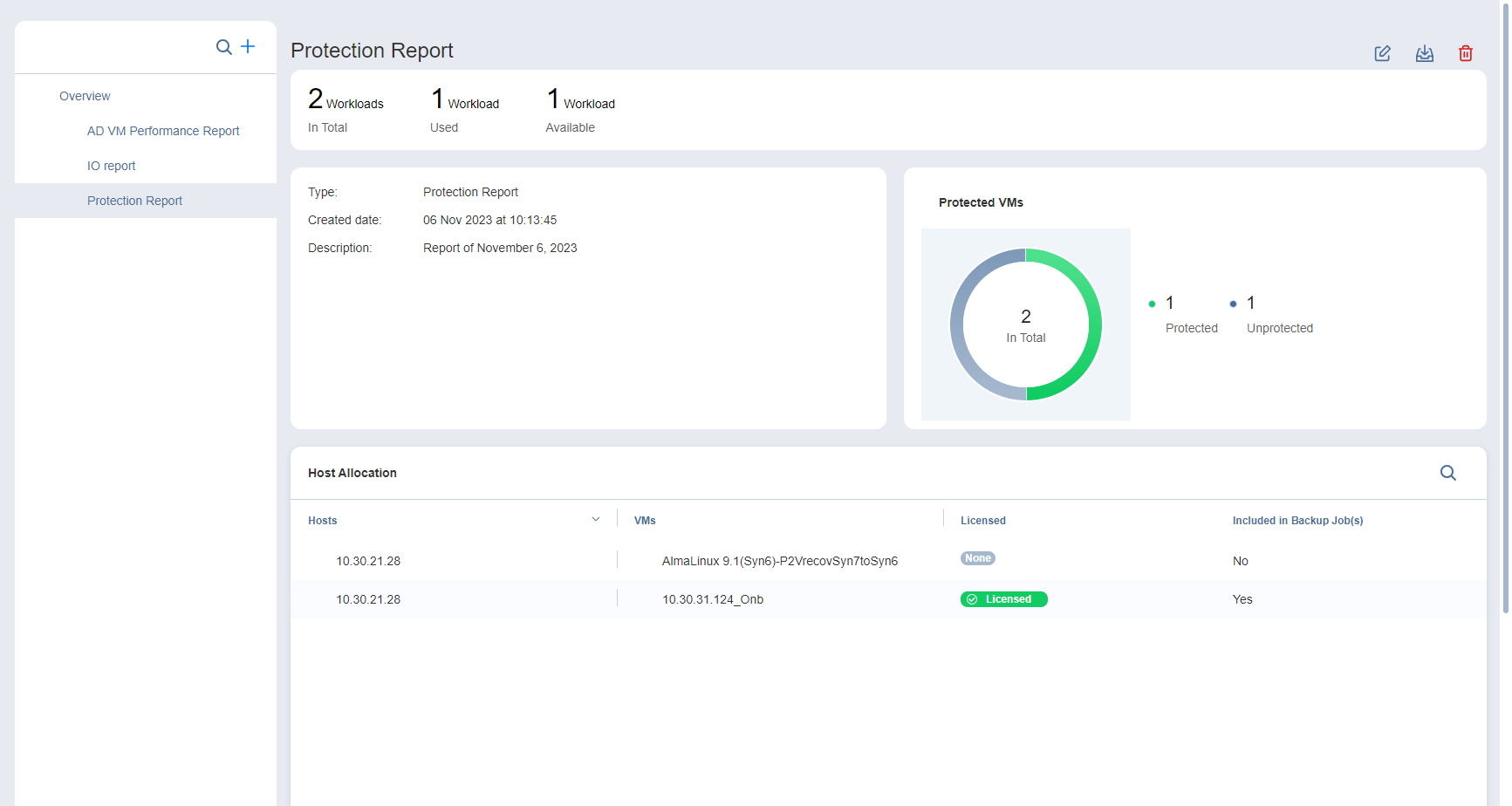 • Protection Report: Displays all discovered hosts and all child VMs.