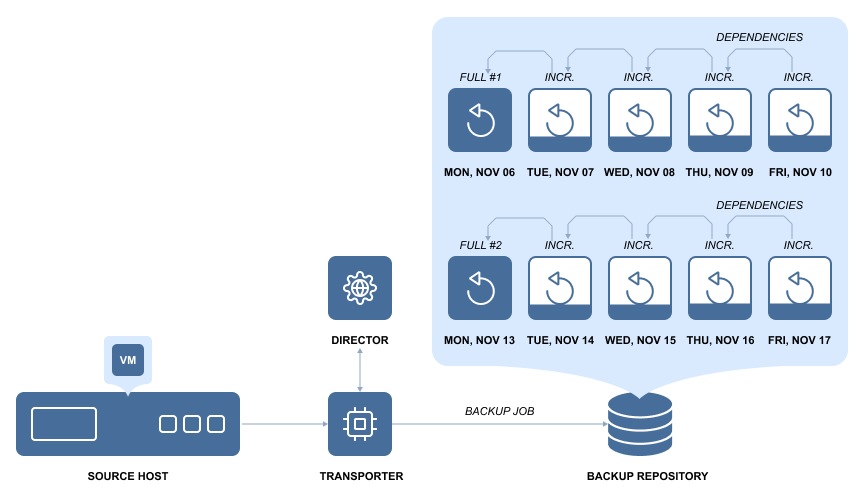 NAKIVO Backup & Replication provides a special type of Backup Repository (stream repository) optimized for high performance with deduplication appliances. With this type of Backup Repository, NAKIVO Backup & Replication supports virtually any type of deduplication appliance as a primary or a secondary backup destination. The architecture of such Backup Repository is based on sequential block write operations through a restricted number of data streams and storing backup blocks in dedicated data files. Data blocks are stored in incremental backup files and full backup files. This means that the repository stores VM backup chains consisting of periodic full backups and several increments between these full backups.