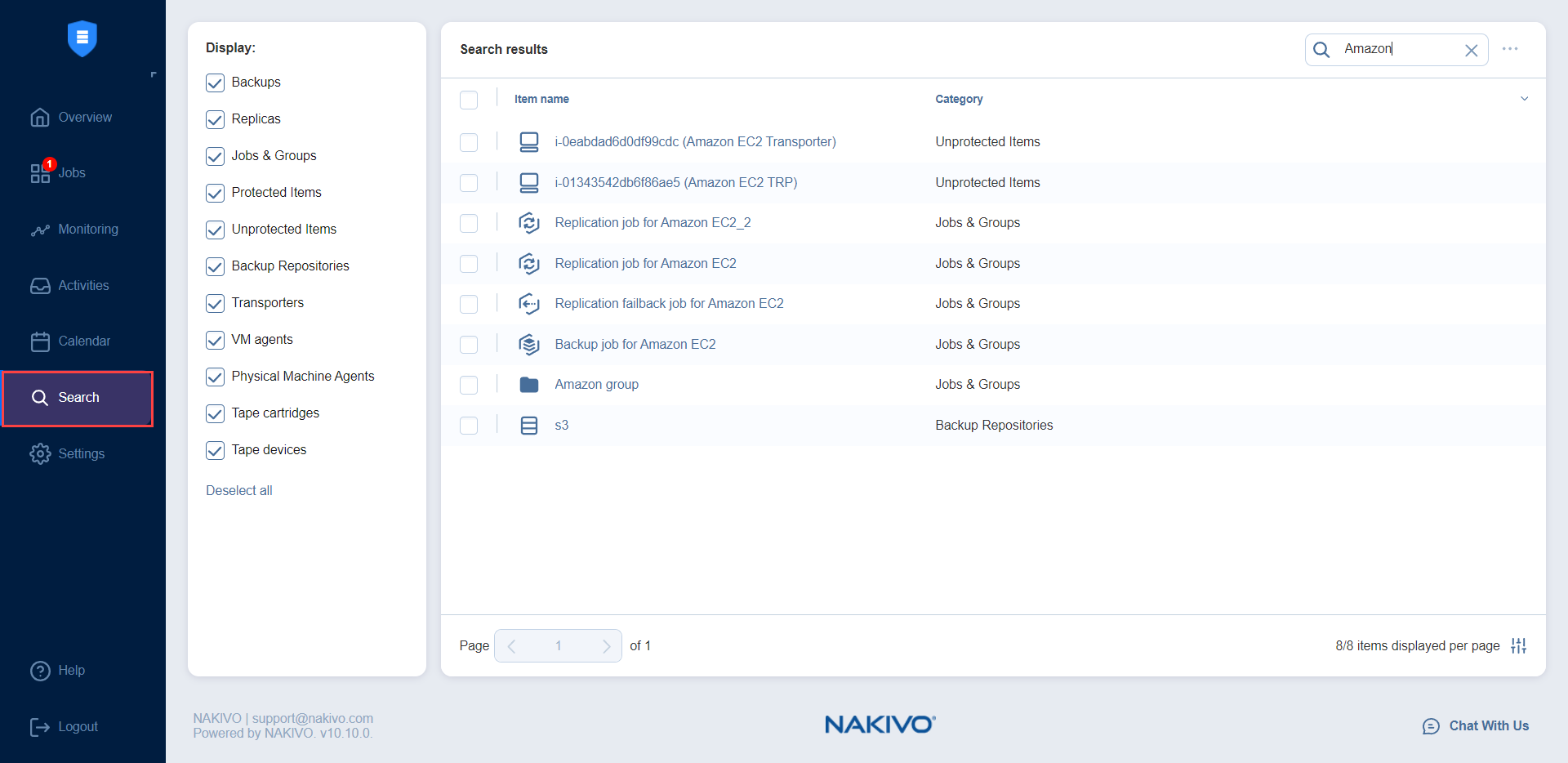 NAKIVO Backup & Replication includes the powerful global search feature that allows you to find any item quickly by entering the name of the item (or part of the name) into the search box. You can refine the search results by using filters (for example, choose to view only VM backups). In addition, you can select items in the search results and instantly perform mass actions on them, such as creating a new job for unprotected VMs or adding items to an existing job. The ability to perform such actions simplifies the management of your backup infrastructure.