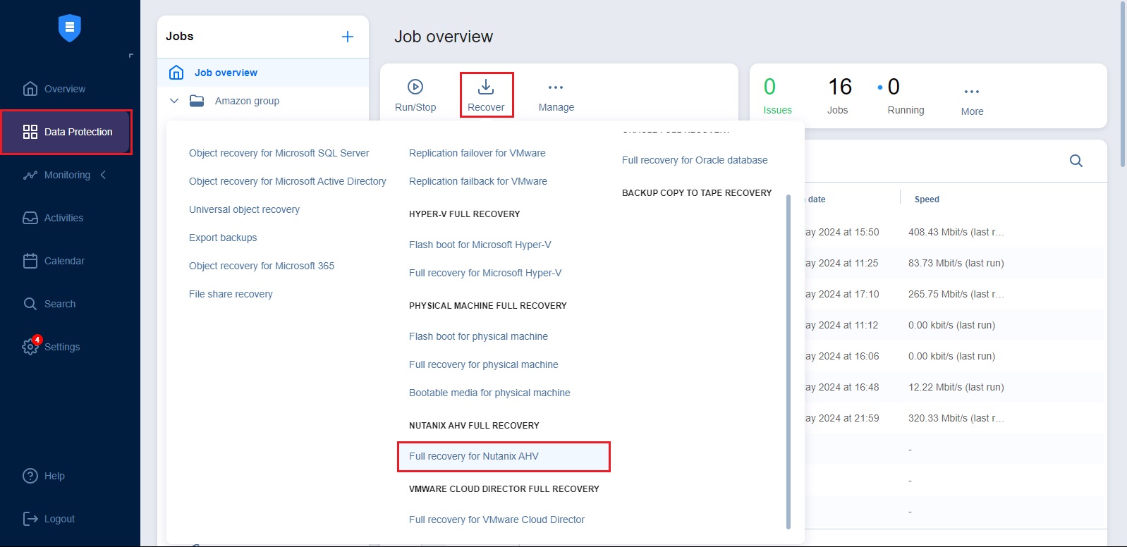 Start recovery from the Data Protection menu by clicking Recover and then clicking Full recovery for Nutanix AHV under the Nutanix AHV Full Recovery section.