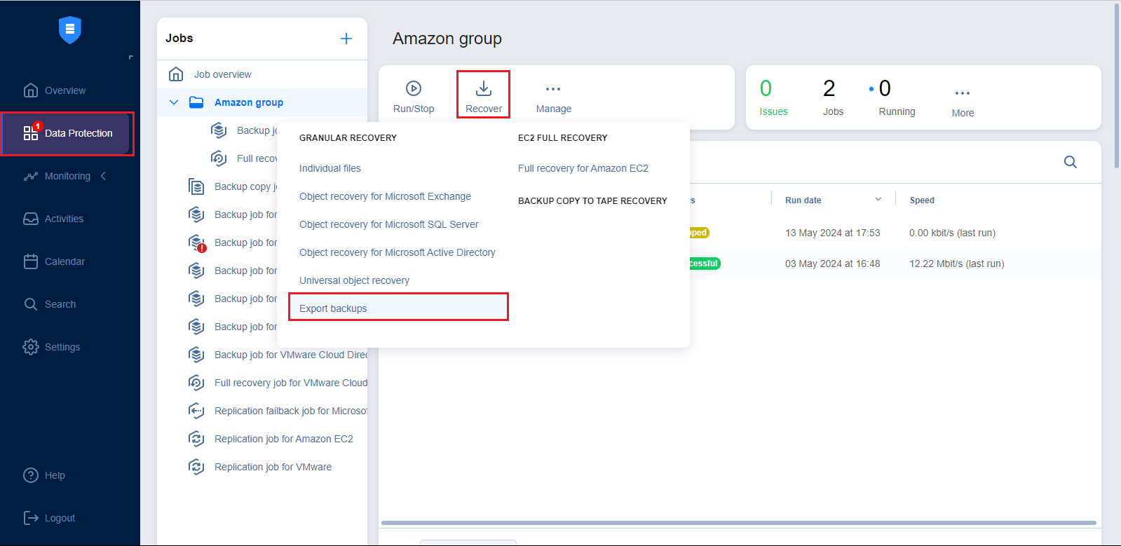 Navigate to the Data Recovery menu, click Recover and then click Export backups.