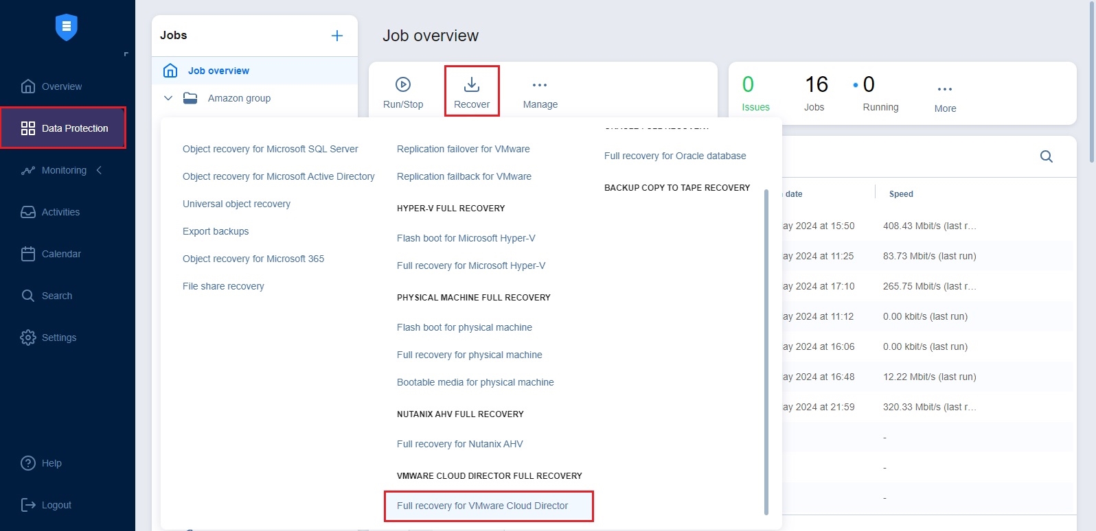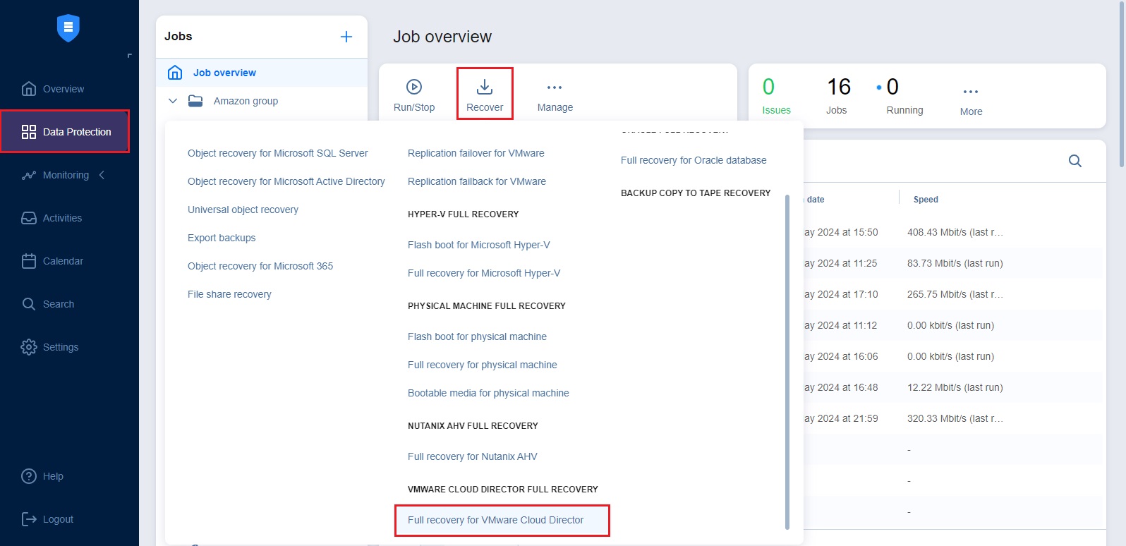• Start recovery from the Data Protection menu by clicking Recover and then clicking Full recovery for VMware Cloud Director.