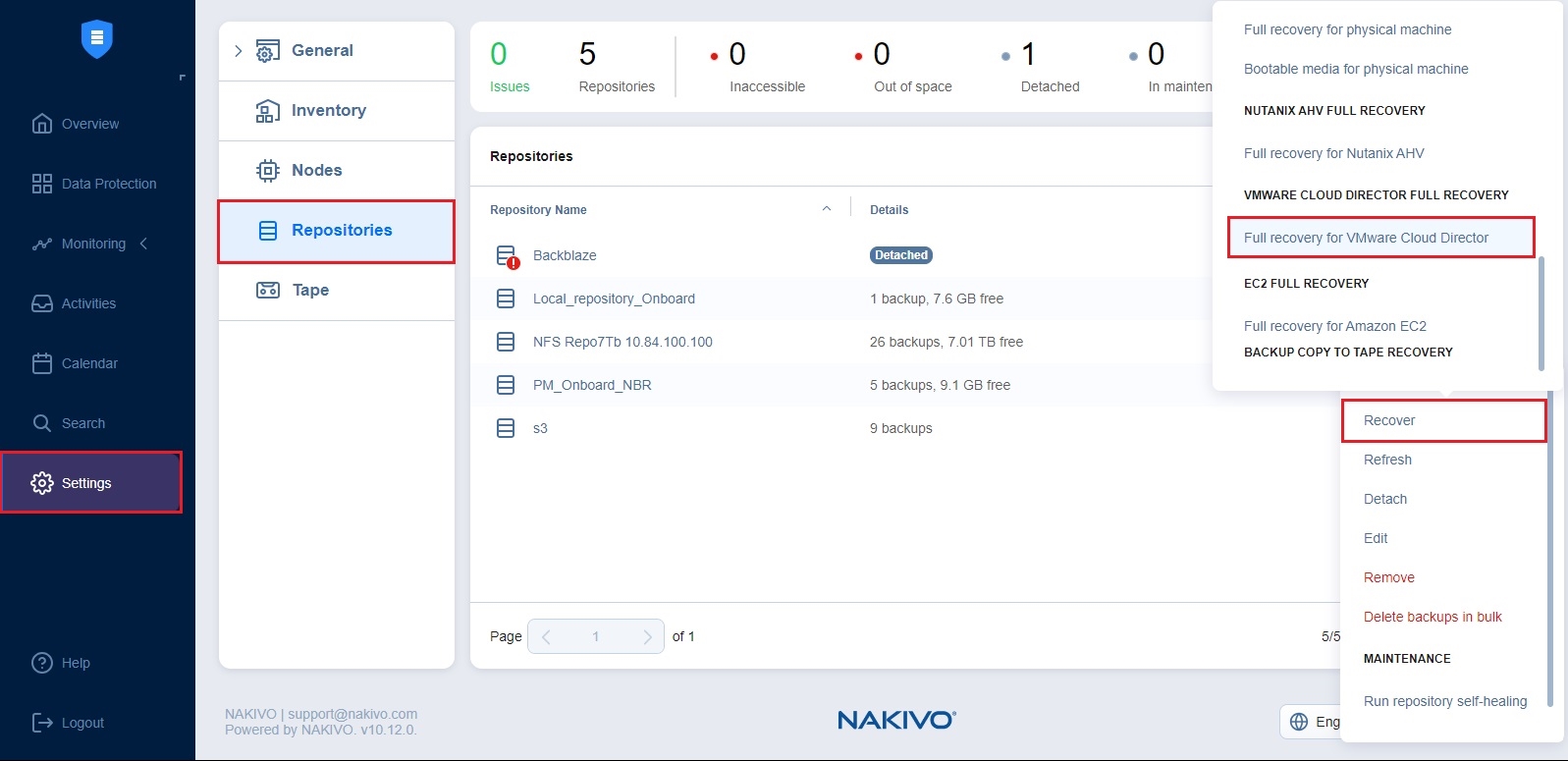 3. Hover over the Backup Repository containing the needed backup, click the ellipsis Manage button, and click Recover