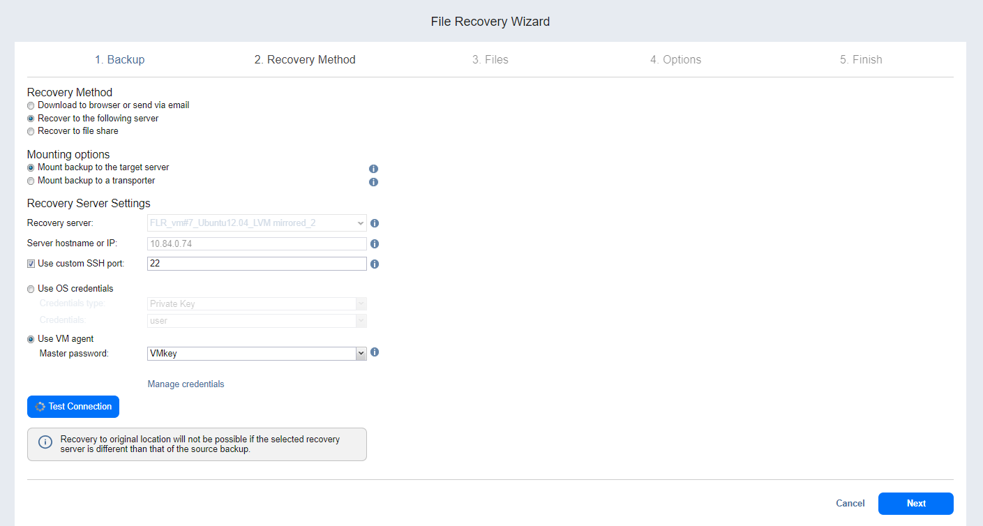 Select the Use VM Agent option to recover the files through the Permanent Agent. The product automatically fills out the Master password if the Permanent Agent is detected from the selected recovery server.