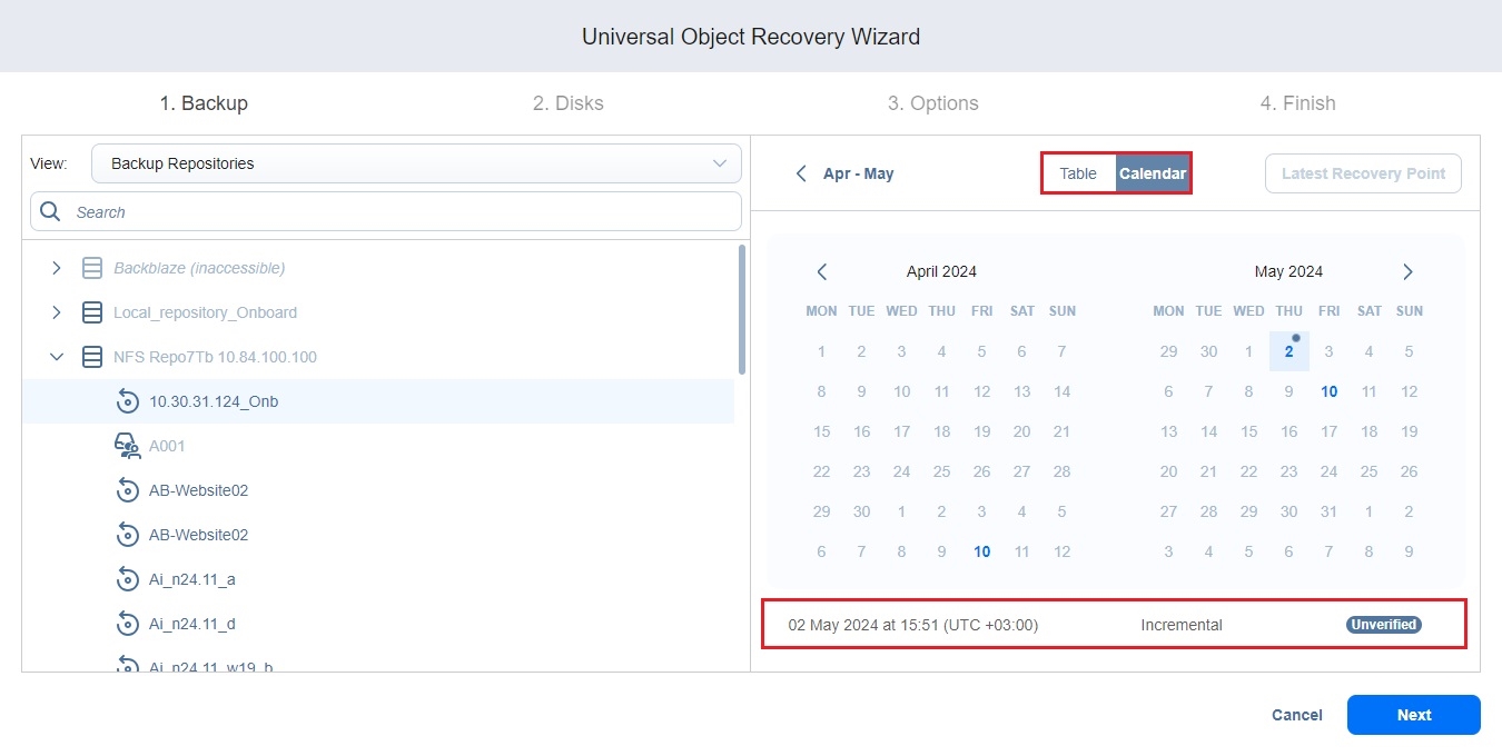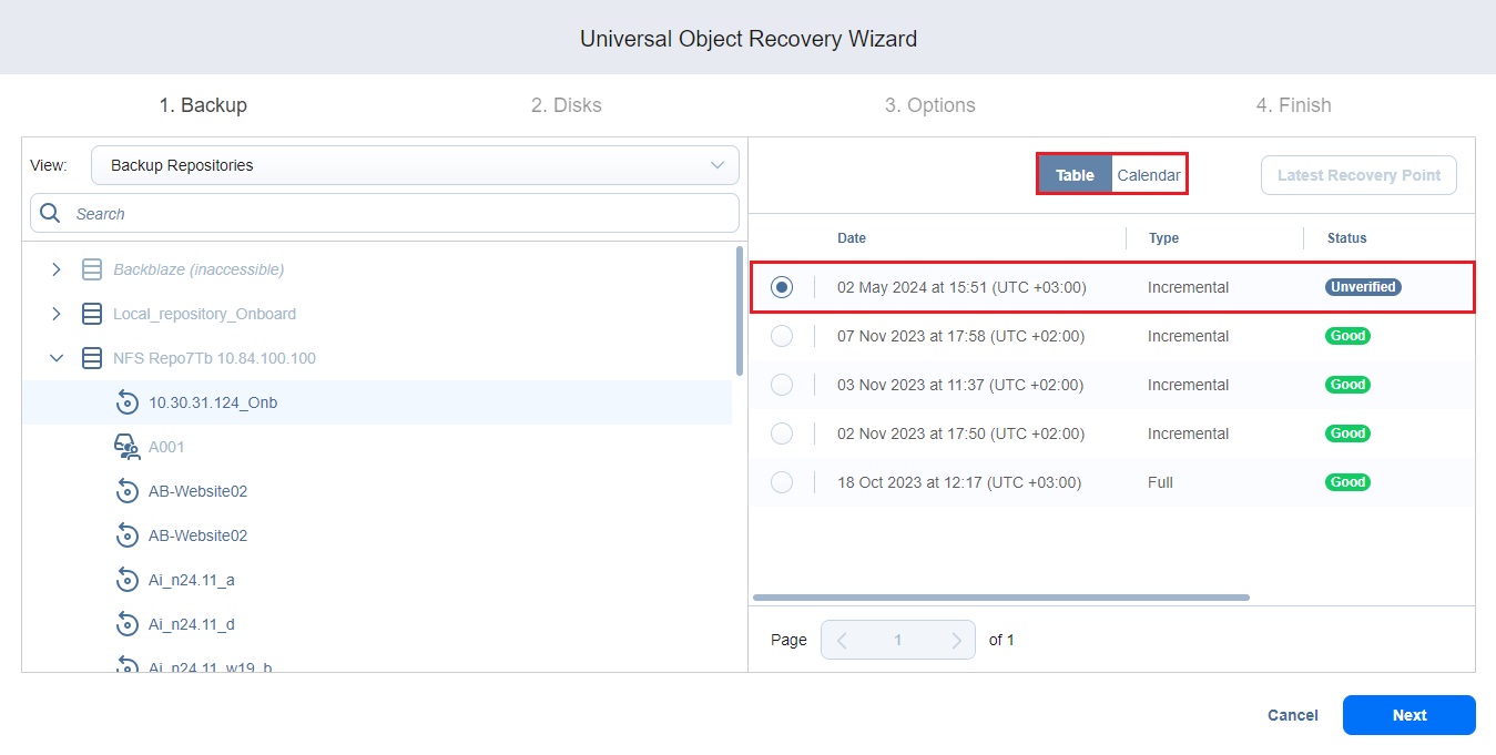 1. On the Backup page of the wizard, select a backup using either the Backup Repositories or Jobs & Groups view in the left pane.