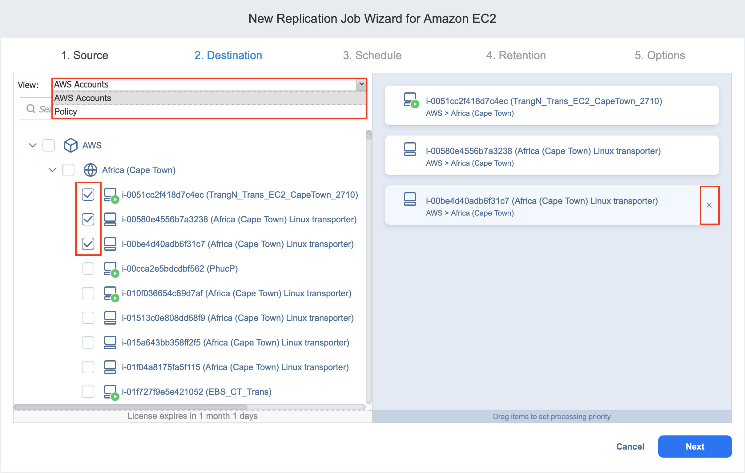 4. Review the list of the selected EC2 items. You can remove a selected item or a container from the replication job using one of the following ways: