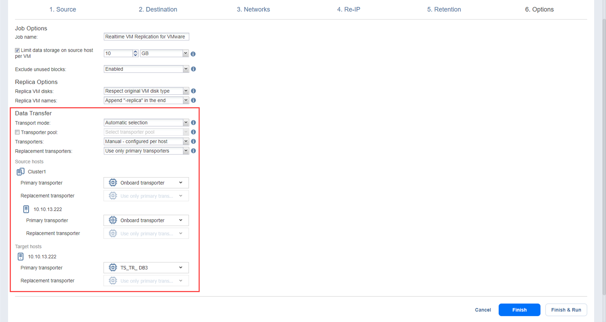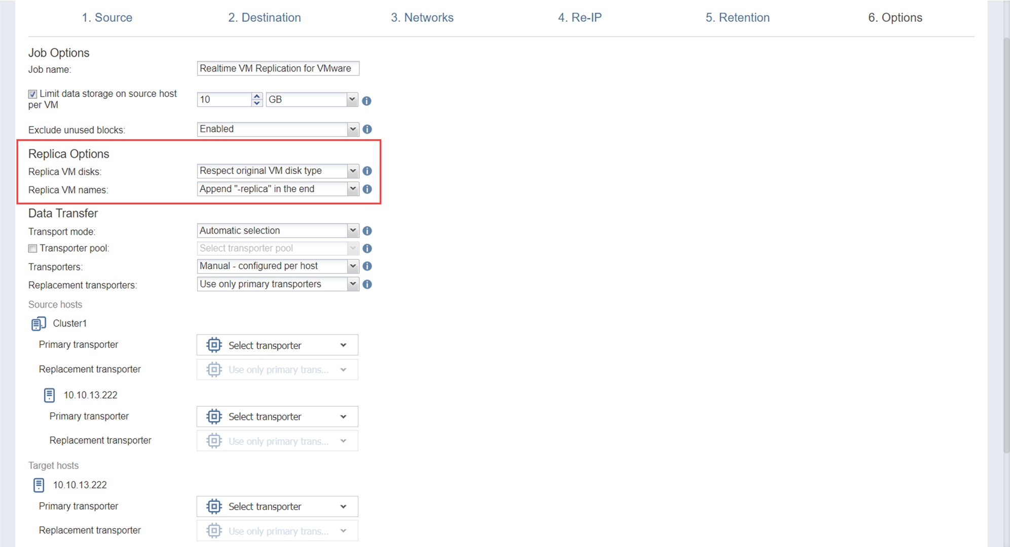 Real-Time Replication (Beta) Job Wizard for VMware: Options