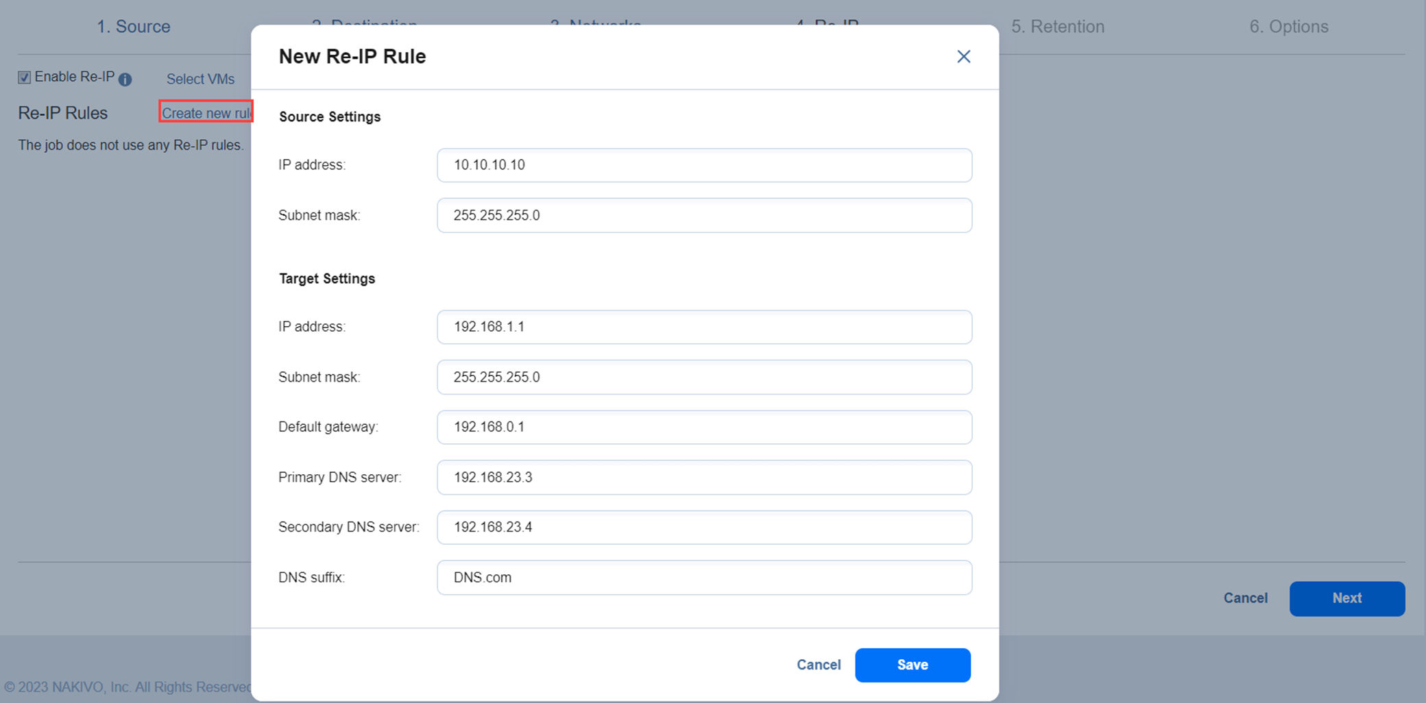 The New Re-IP Rule dialog box opens. Enter source and target settings for the Re-IP rule and click Save.