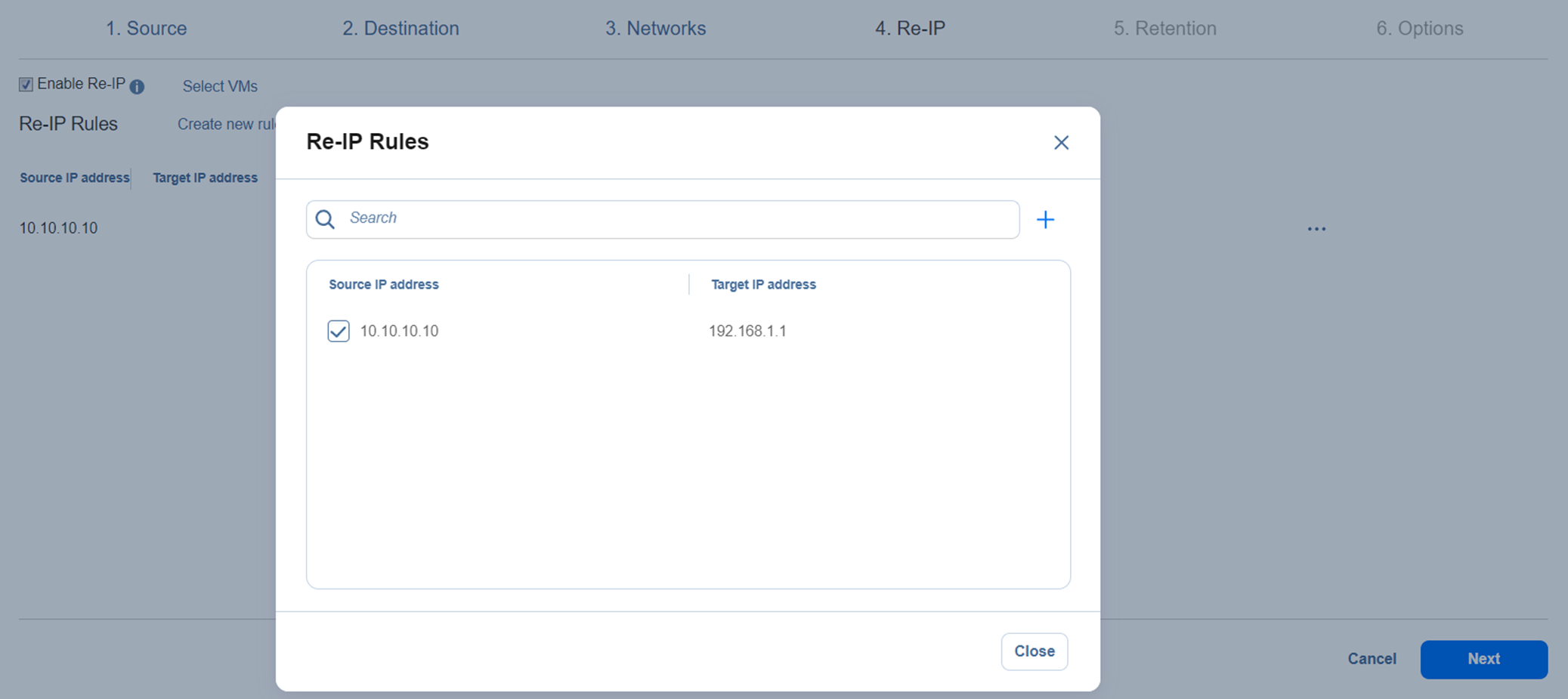 The Re-IP dialog box opens. In the list of your source VMs, select at least one, and close the dialog box.