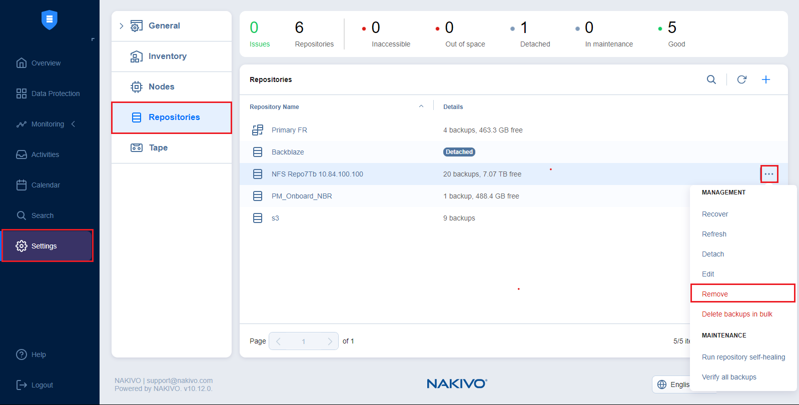 In NAKIVO Backup & Replication, you can either permanently delete a Backup Repository and all of its data or remove only the Backup Repository from the product while maintaining all of its data. After removing a Backup Repository you will be able to import it into the same or a new instance of the product.