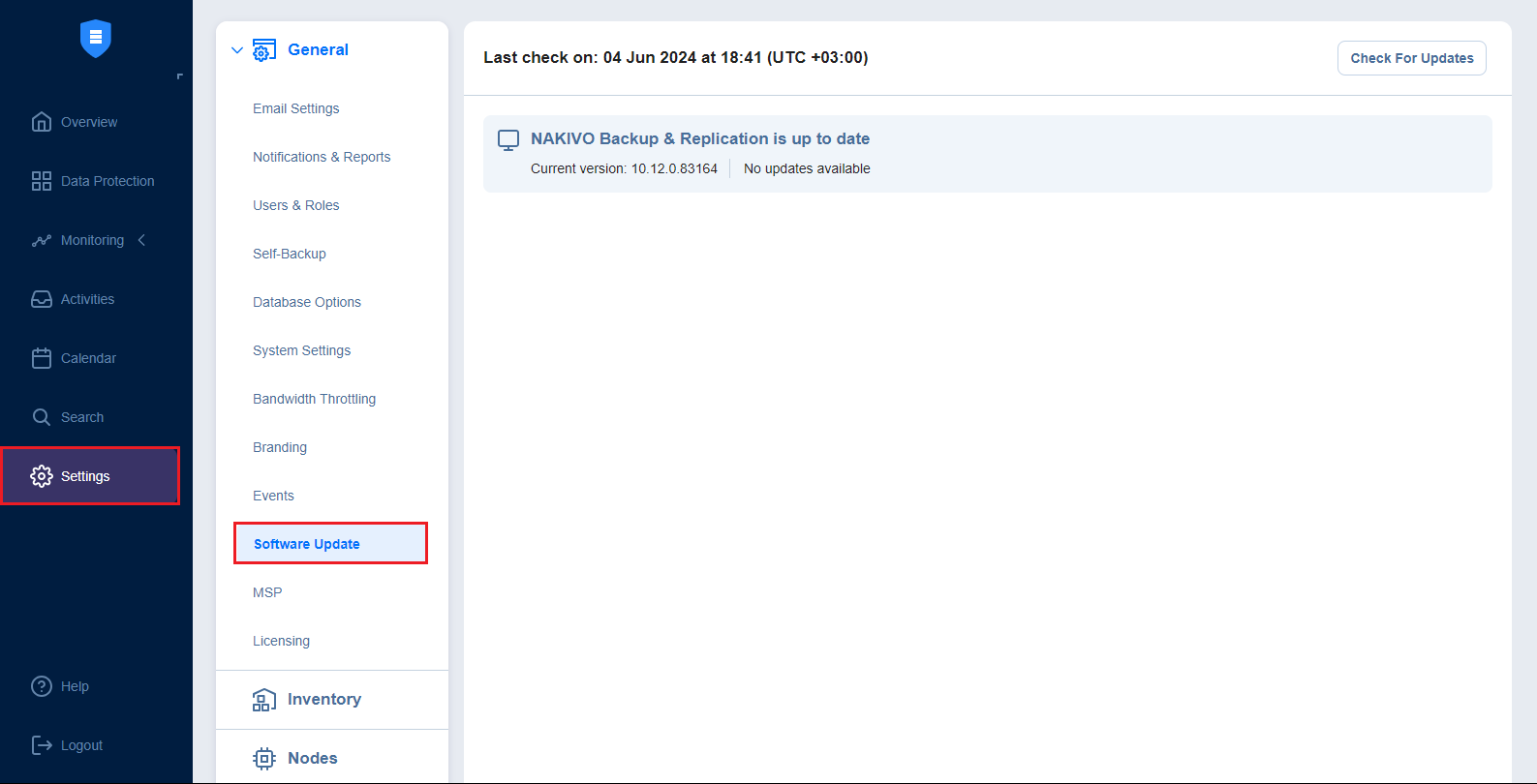 When the full solution of NAKIVO Backup & Replication (that is, the Director and the Transporter) is installed on a Windows or Linux machine, you can download product updates from the Software Update tab in the web interface. This feature automatically updates your NAKIVO Backup & Replication instance, the Onboard Transporter, and any other nodes that support auto-update.