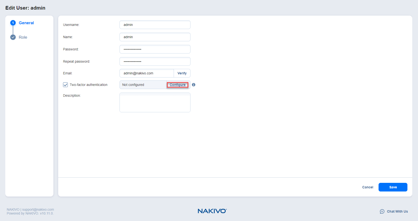 NAKIVO Backup & Replication uses Google Authenticator for two-factor authentication. To set up Google Authenticator, do the following: