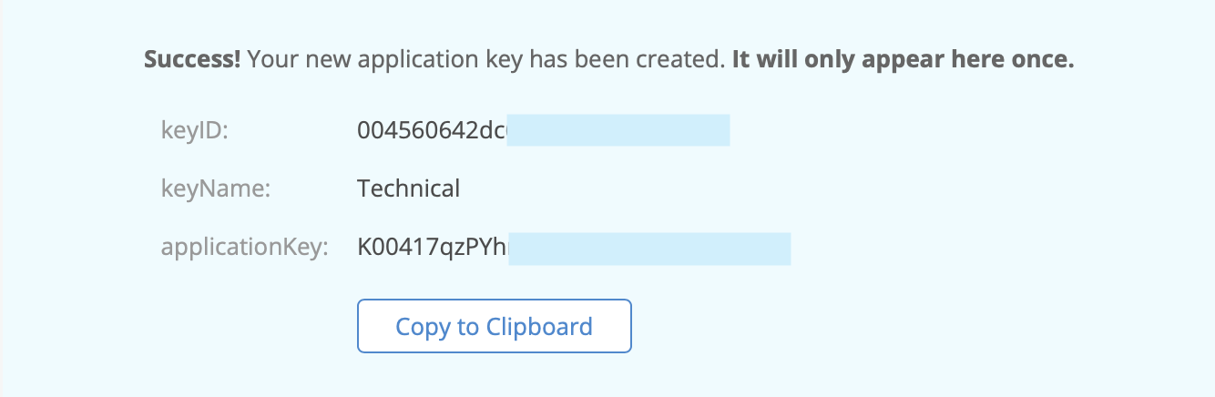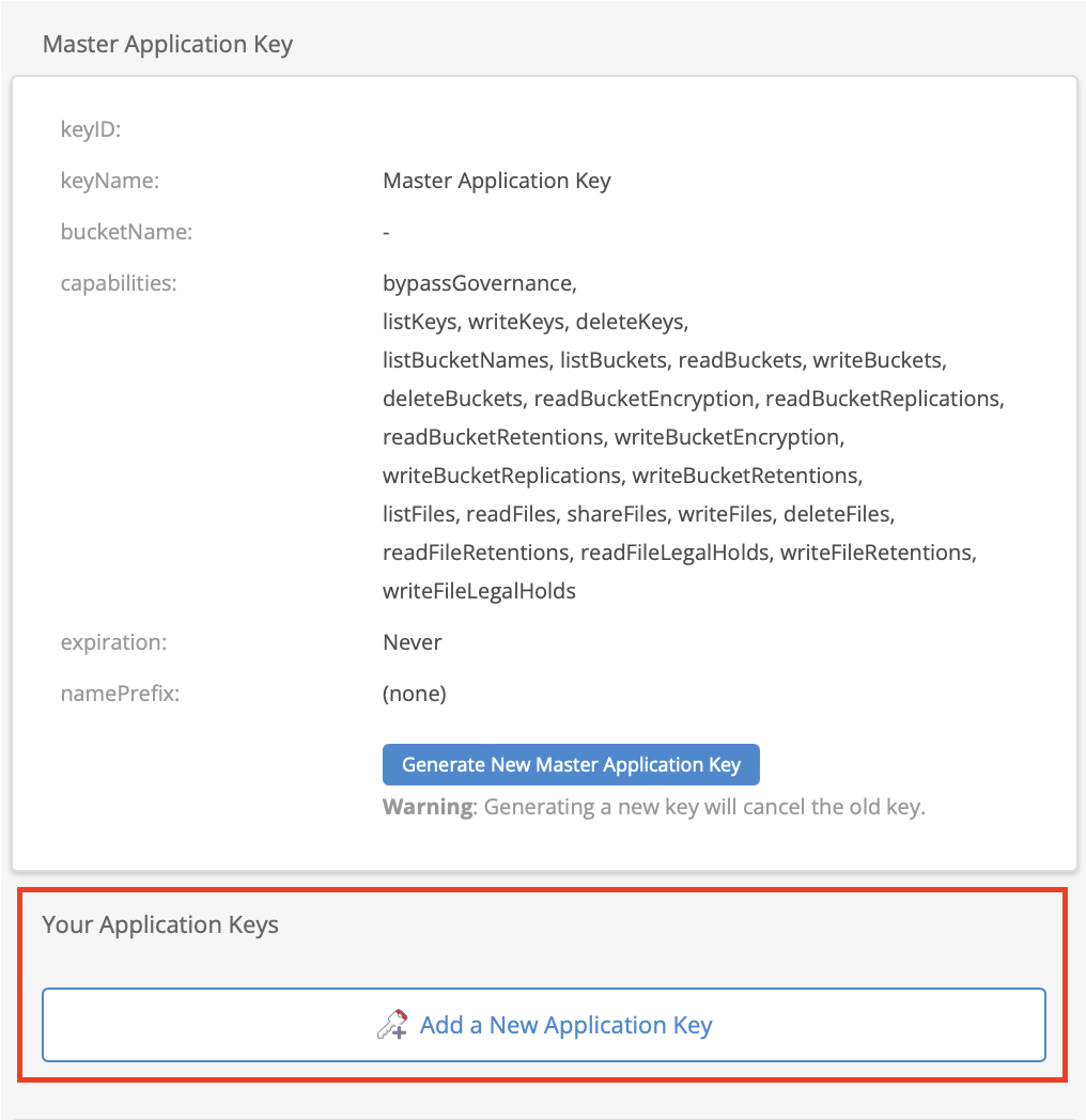 Application Key: Enter the Application Key generated on the App Keys page in your Backblaze account.