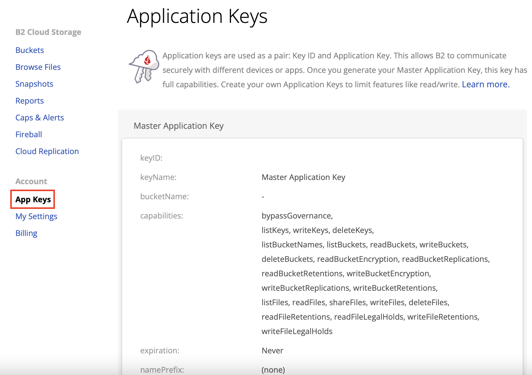 Key ID: Enter the keyID generated on the App Keys page in your Backblaze account.