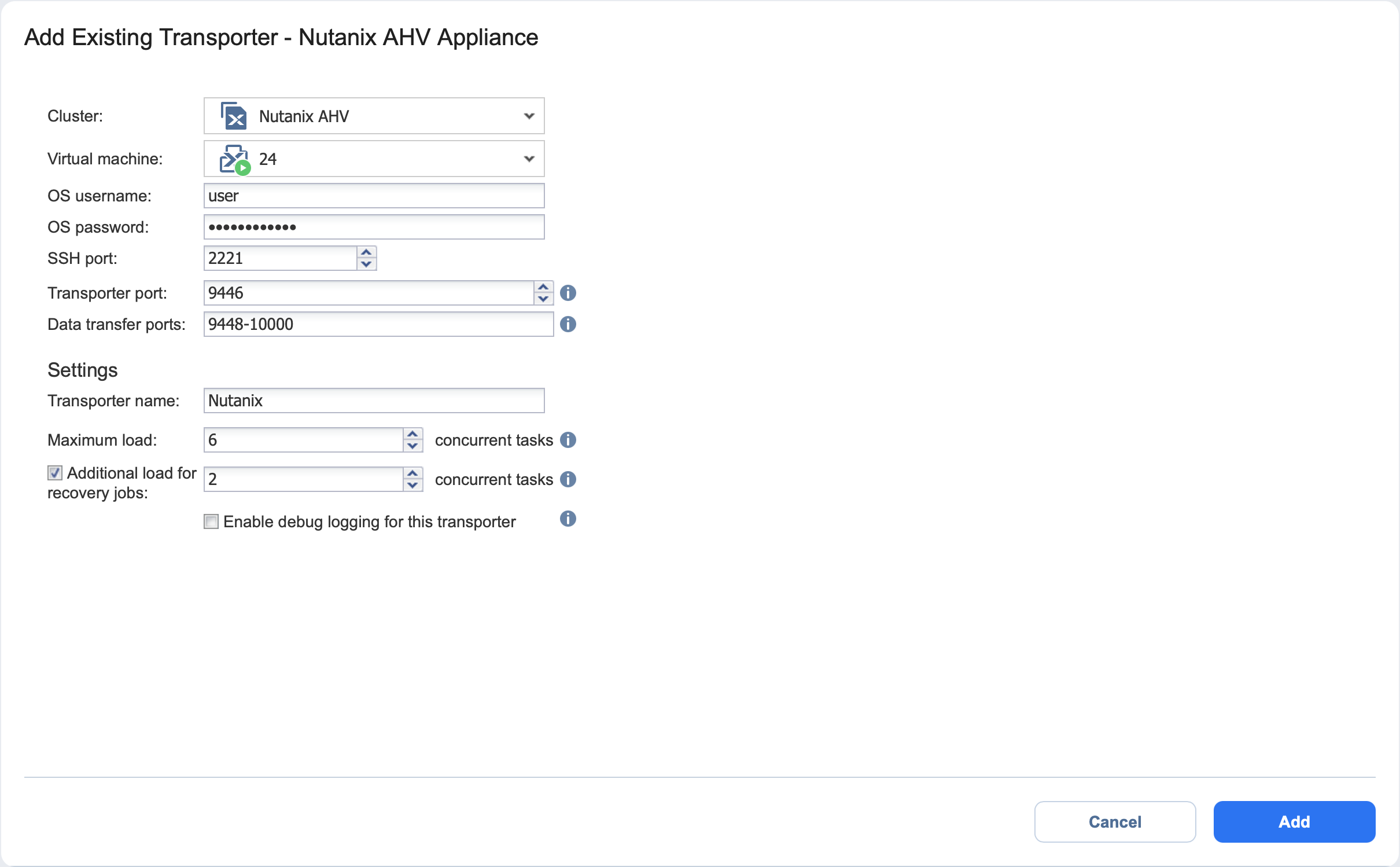 In the Add Existing Transporter - Nutanix AHV Appliance dialog, enter the following options: